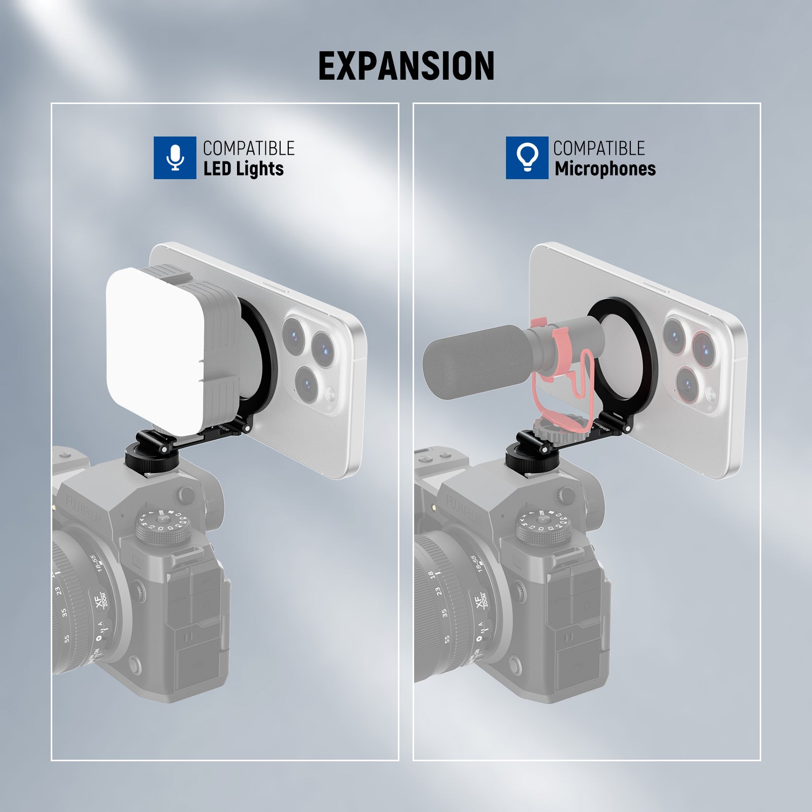 • Magnetic Phone Mount with Cold Shoe- Snap to attach your smartphone to a camera via a cold shoe adapter, or a tripod, selfie stick, or stabilizer via a 1/4" thread, as content creator essential influencer must have photography accessories