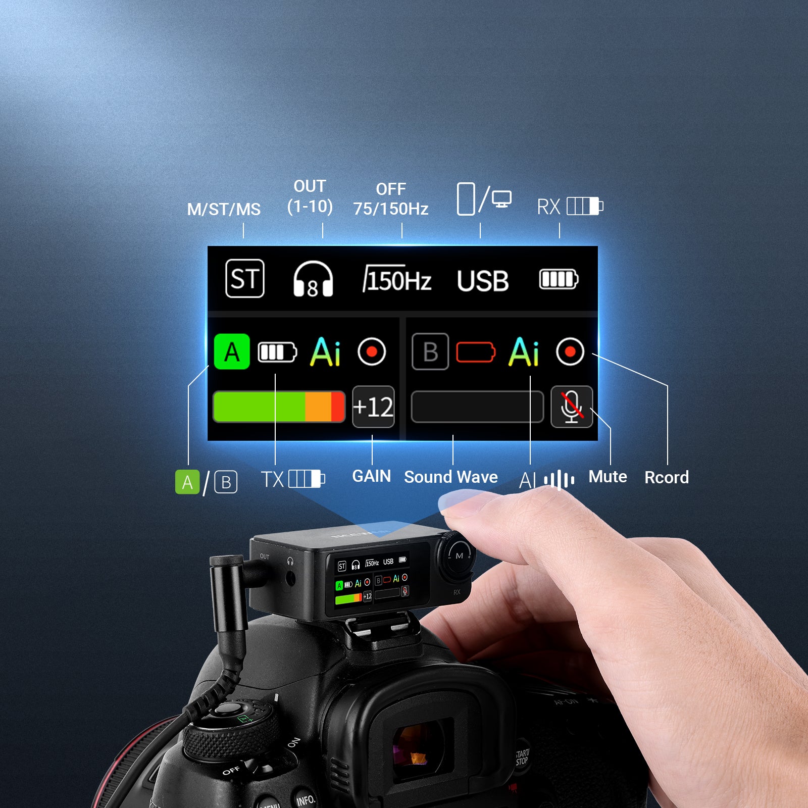 - Flexible & Precise Setups- Both TX channels support -12 to +12 independent gain control based on sensitivities, pickup distances, and scenarios to maintain accurate input levels whether speaking close to or far from the mic. RX output supports 1-10 gain adjustment to match the input of recording device and prevent distortion or low volume. This ensures balanced volume management and dynamic optimization across the entire audio signal chain for clear, stable, and controllable voice output