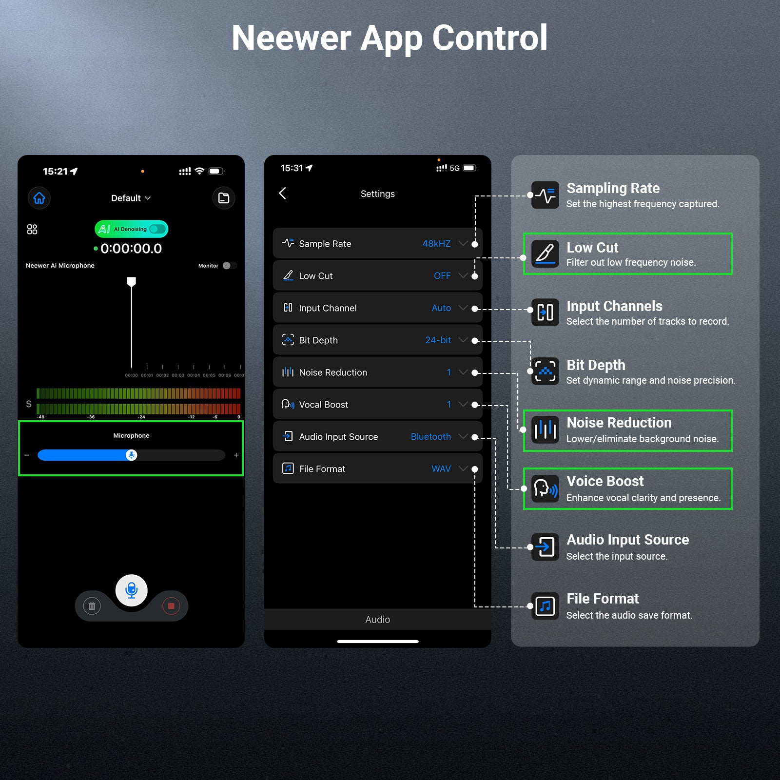 - AI Noise Cancellation- Unlike the traditional way that can only reduce steady noise, AI noise cancellation uses an adaptive deep-learning voice enhancement model to precisely minimize non-steady noise such as traffic, wind, and interference for clean and pure sound. Compatible with iPhone iPad Android phones tablets cameras computers laptops