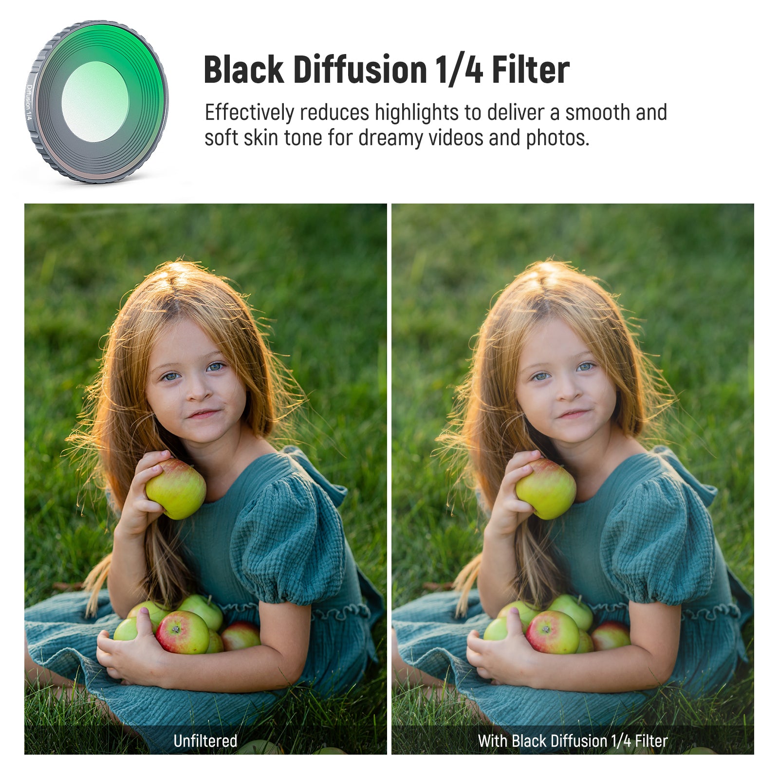 - Cinematic Soft & Dreamy Effect- The black diffusion 1/4 filter can smooth skin texture, diffuse highlights, and add a dreamy effect to your shots, perfect for portrait photography, selfies, and personal vlogs