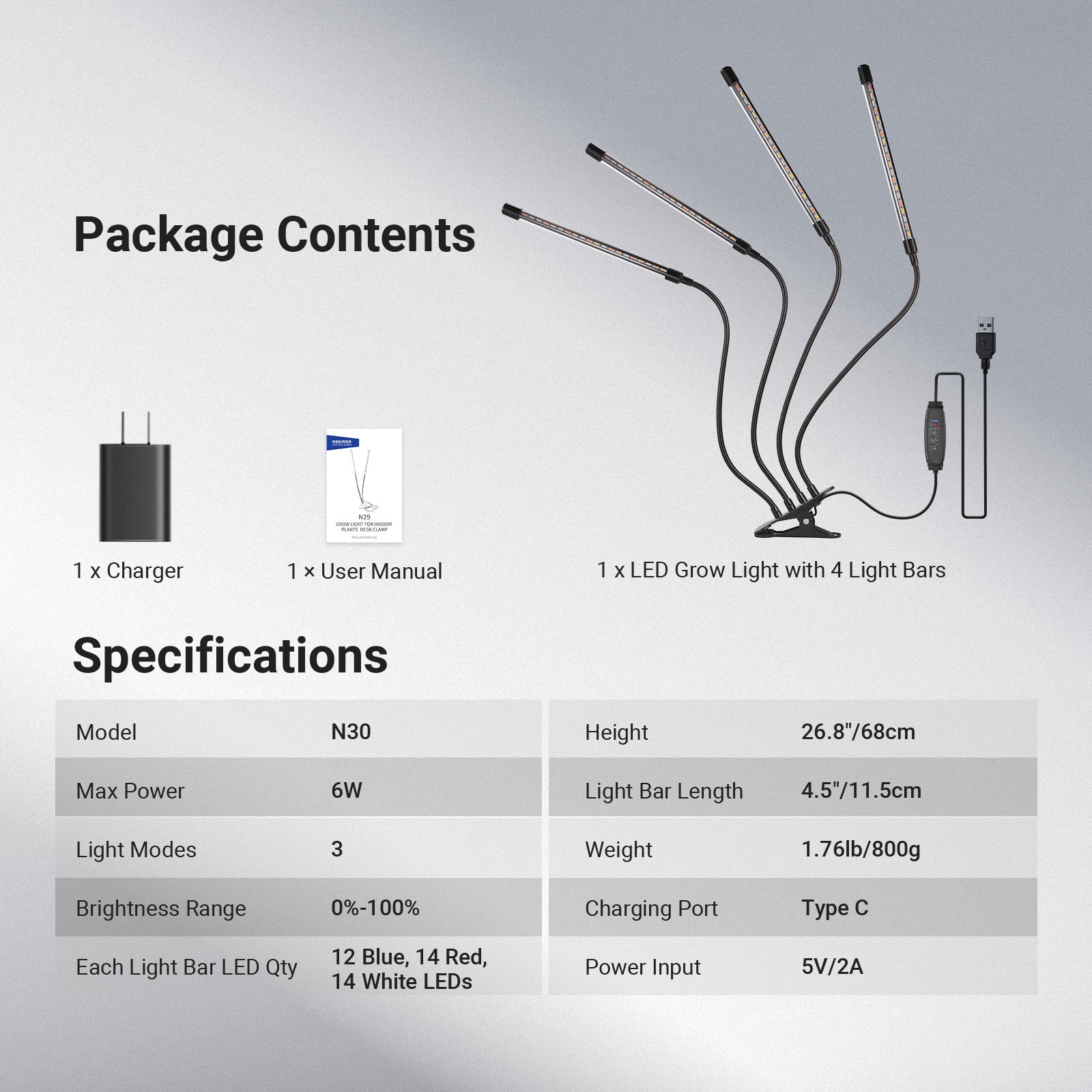 - Full Spectrum Desk Grow Lights- Featuring 48 blue, 56 red, and 56 white LEDs, NEEWER N30 clip on growing light for indoor gardening provides a full spectrum that closely mimics natural sunlight, supporting healthy growth of herb gardens, bonsai, flowers, and other potted plants