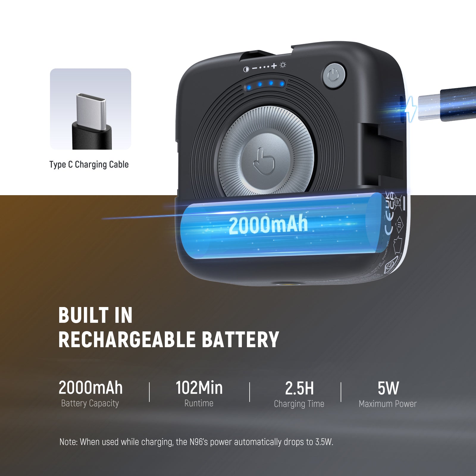 - 2000mAh Rechargeable Battery- The clip on selfie light features a built in 2000mAh rechargeable lithium battery, providing up to 102 minutes of continuous lighting at 100% brightness. It fully recharges in approximately 2.5 hours using the included USB A to USB C charging cable