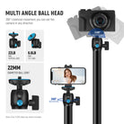 - Multi-Angle Ball Head- With a 360° swivel movement, the ball head enables you to set up your camera in any direction, and the U-shaped notch allows -45° to +90° vertical tilt for portrait or landscape camera orientations