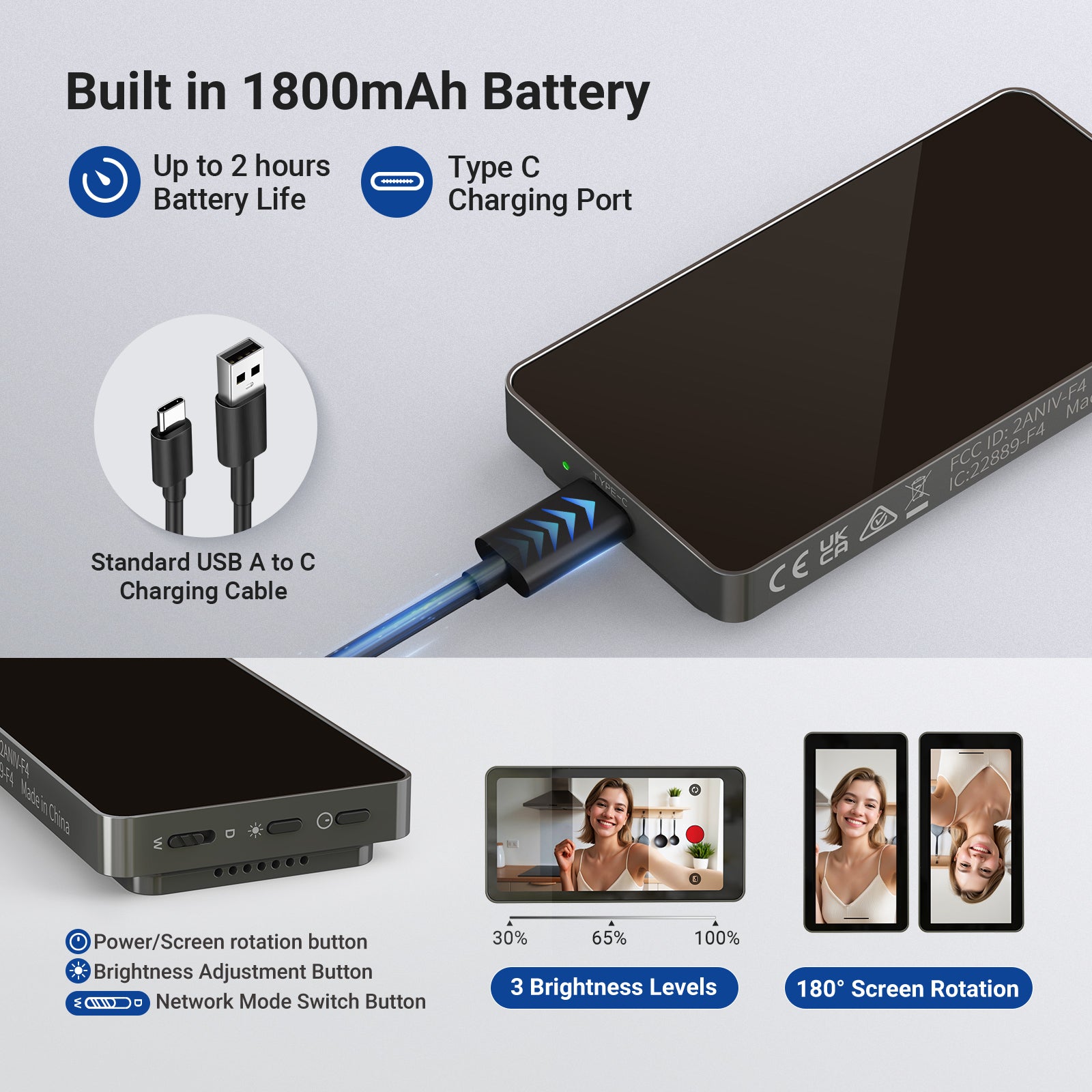 - 1800mAh Battery- Get up to 2h continuous use on a full charge. Recharges easily via the USB C port with portable chargers, laptops, car chargers, etc. The F4 back camera selfie monitor supports one click 180° screen rotation to eliminate inverted images