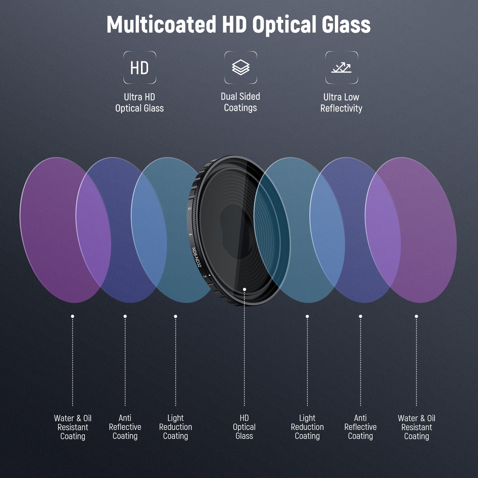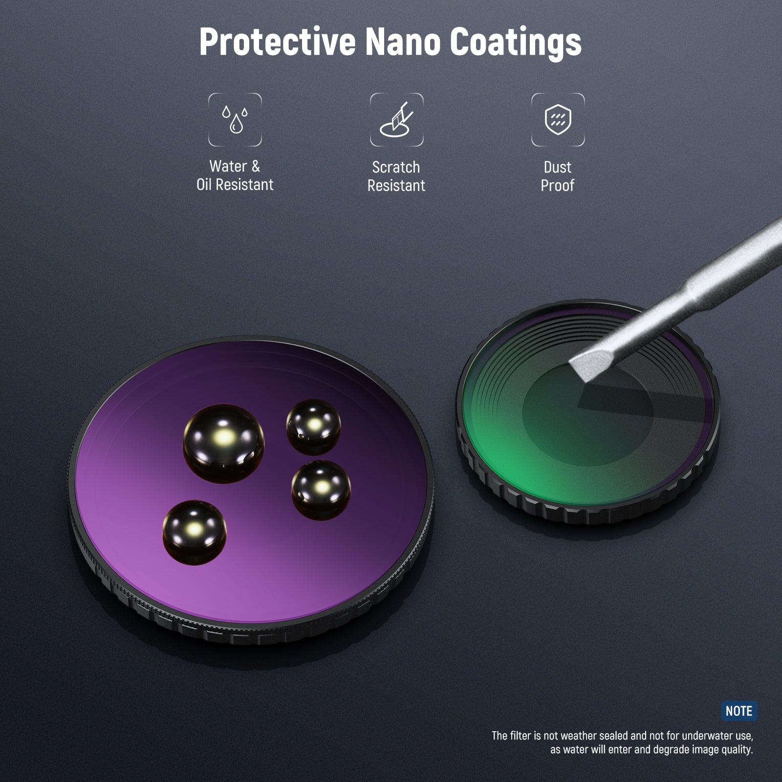 - Easy & Precise Exposure Control- The variable ND8-32 neutral density action camera lens filter reduces light by 3-5 stops for flexible exposure control. Rotate the outer frame to marked positions for precise adjustment and creative motion blur. Note: Slight vignetting may appear at the highest ND setting in ultra wide angle mode. This is a normal optical characteristic and does not affect overall image quality