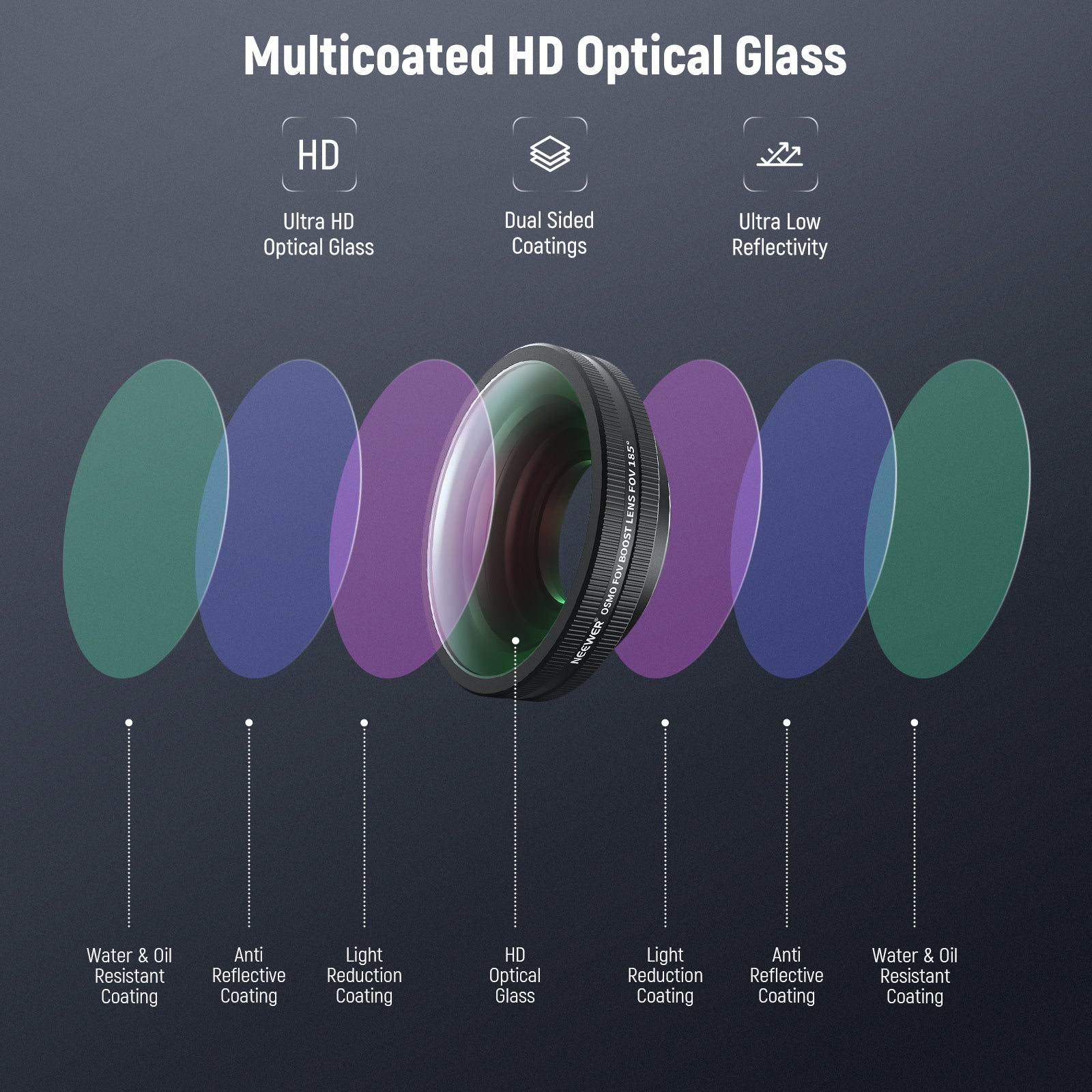 - Wide Angle Lens with 185° FOV- The wide angle lens expands the field of view (FOV) to 185° and creates a slightly distorted effect for creative shots, perfect for landscape, street photography, and group portraits. Its highly transmissive aspherical lens construction delivers exceptional clarity