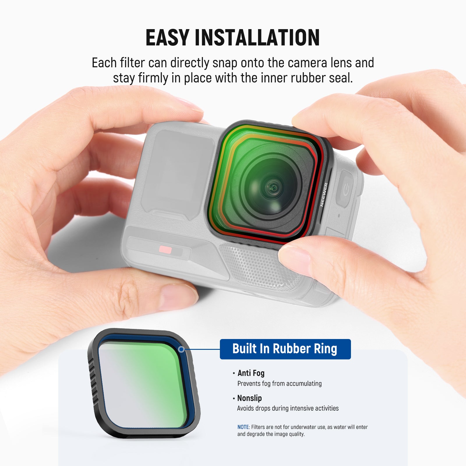 - Fast Snap On Attachment- Each filter can directly snap onto the camera lens and stay firmly in place with the inner rubber seal. Note: Filters are not for underwater use, as water will enter and degrade the image quality