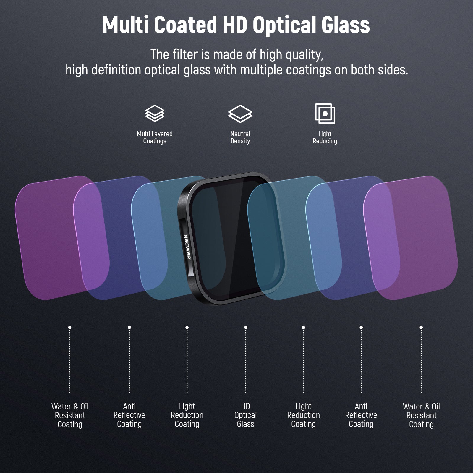 - Multi Coated HD Optical Glass- Each filter is made of high quality, high definition optical glass with multiple coatings on both sides. These coatings make the filters water, scratch, and oil resistant, ensuring long lasting optical performance even in harsh environments