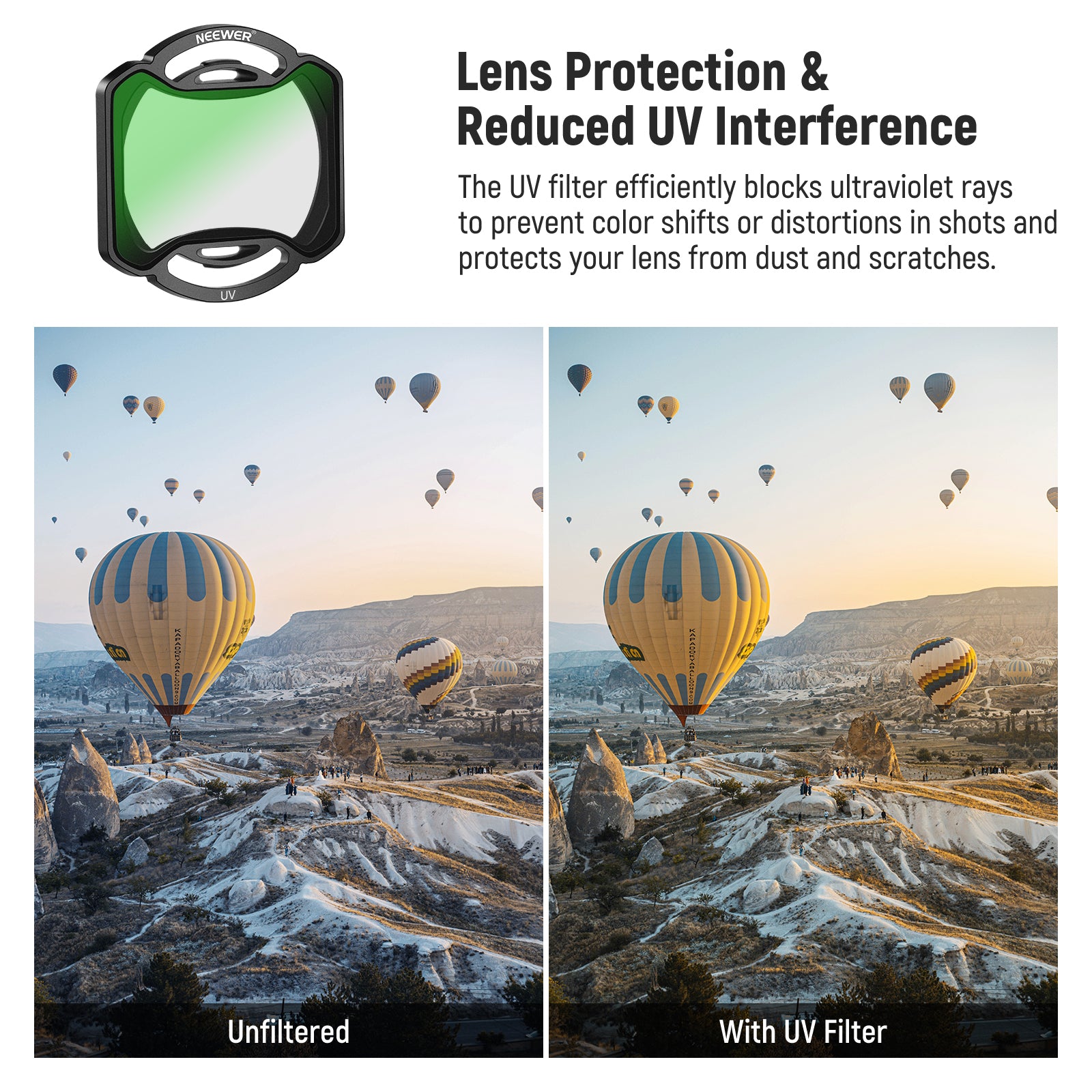 - Lens Protection & Reduced UV Interference- The UV filter efficiently blocks ultraviolet rays to prevent color shifts or distortions in shots and protects your lens from dust and scratches. It helps capture images and footage with stunning clarity, suitable for shooting in strong sunlight