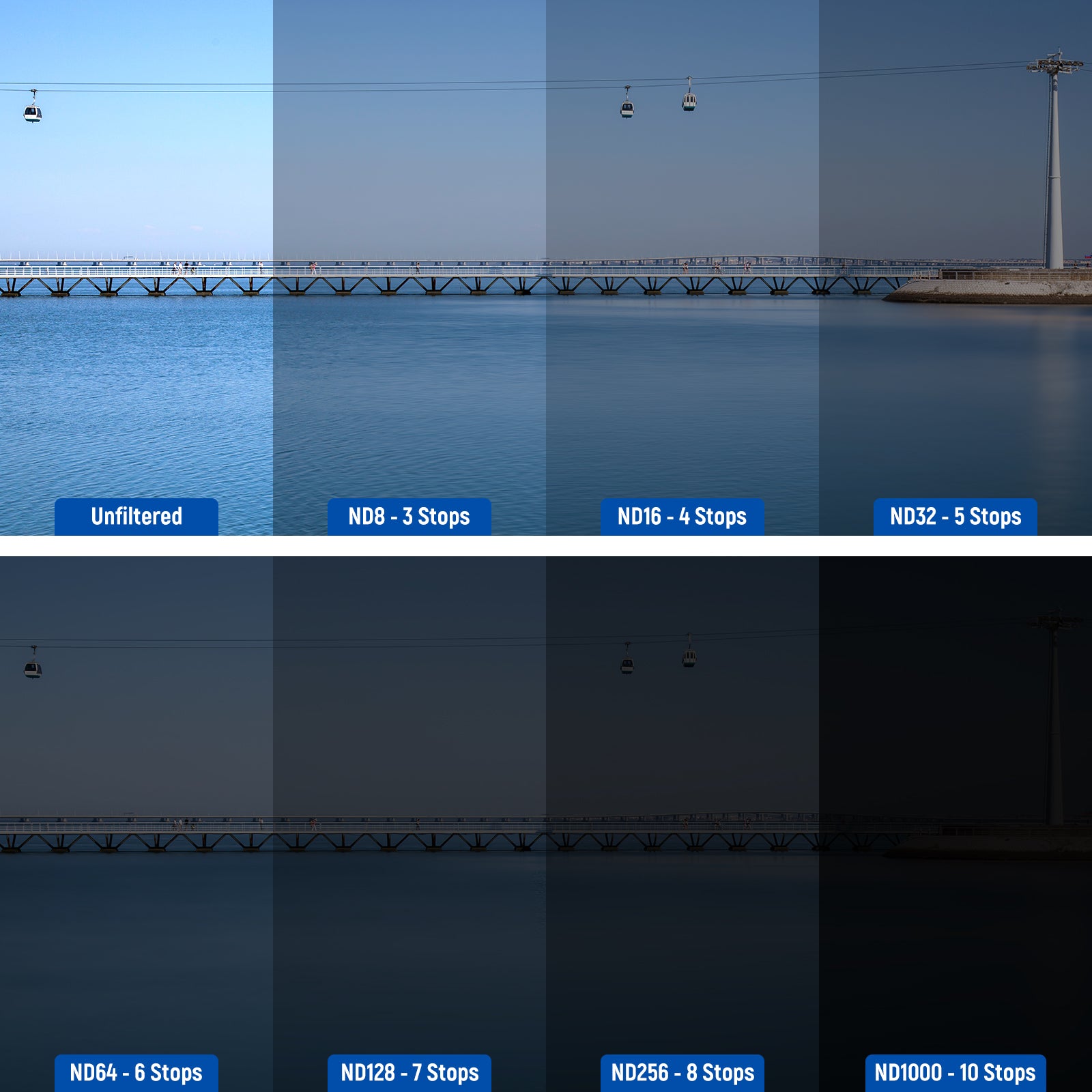 - Precise Exposure Balance- Seven ND filters compatible with DJI Osmo Pocket 3 (ND8, ND16, ND32, ND64, ND128, ND256, and ND1000) reduce light by 3, 4, 5, 6, 7, 8, and 10 stops respectively, suitable for long exposure photography in bright outdoor conditions. They allow you to shoot at slower shutter speeds with larger apertures and capture movements with expressive motion blur effects