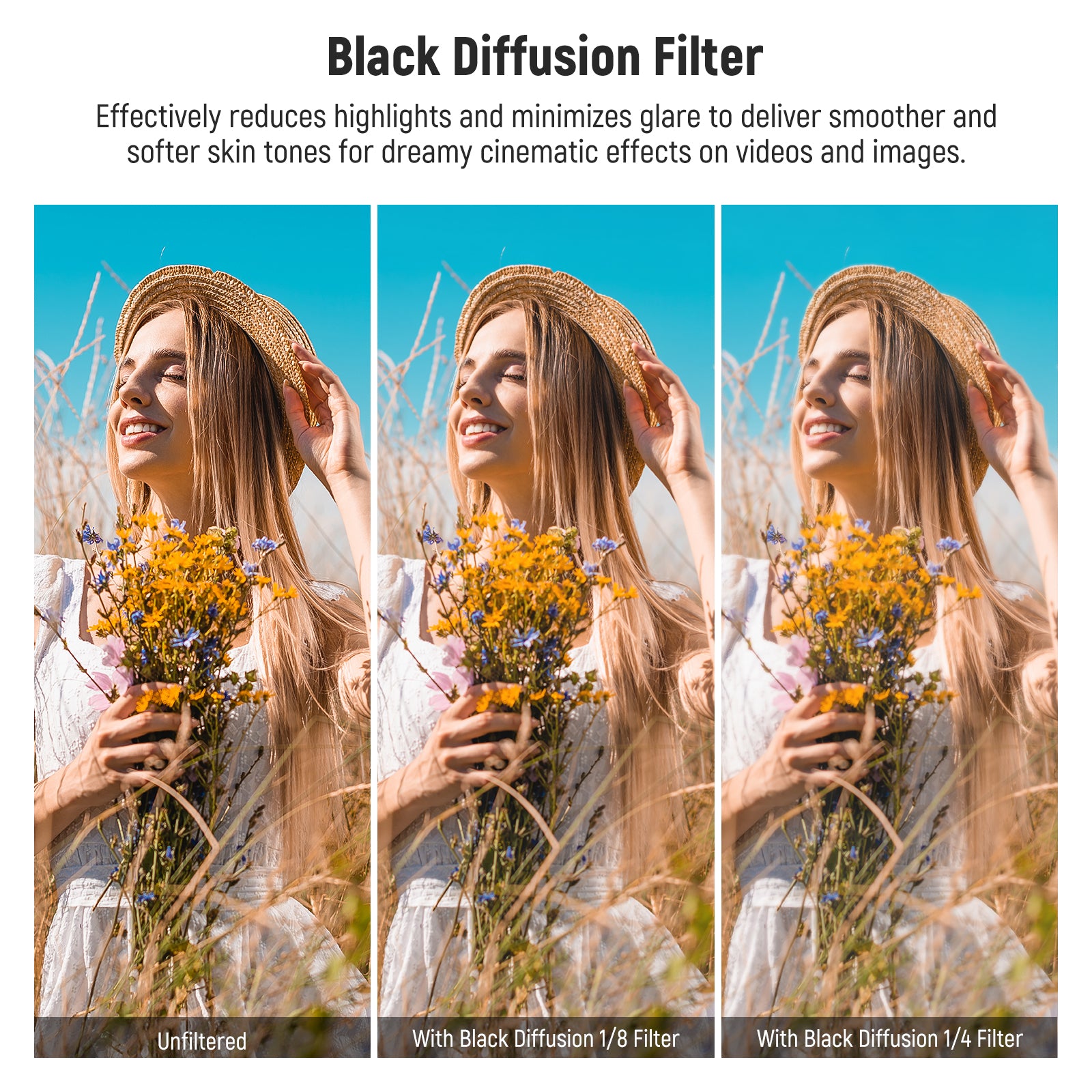 - Soft & Dreamy Cinematic Vibe- Black diffusion 1/4 and 1/8 filter can smooth out skin texture while adding a dreamy and hazy effect to your shots, perfect for portrait photography, selfies, action-packed scenes, and personal vlogs as essential and must have photography accessories for content creators/influencers' gimbal camera gears