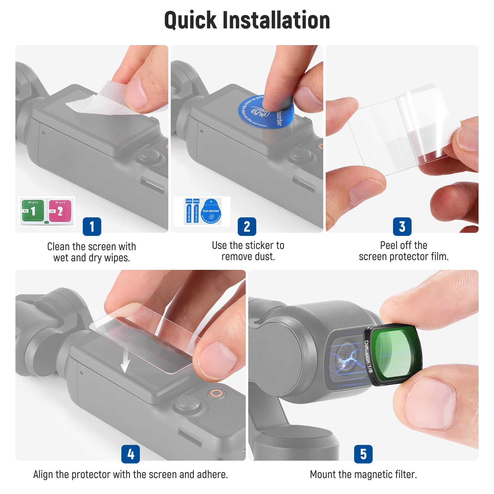 - Compatible with DJI Osmo Pocket 3- This 1/4 and 1/8 black diffusion filter set is compatible with DJI Osmo Pocket 3. A game changer for handheld gimbal camera seasoned pros and enthusiasts, it features instant and secure magnetic attachment and HD optical glass for crystal clear imaging during vlogging and camera shooting