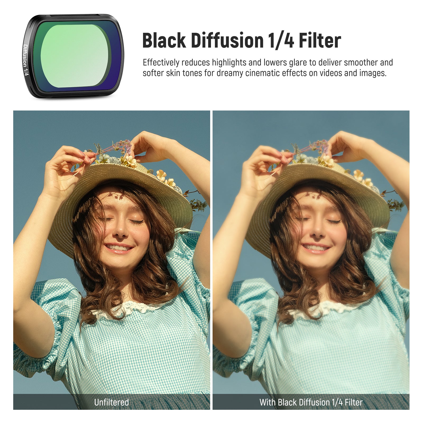 - Exposure Control & Dreamy Effect- Three ND filters reduce light by 4, 6, and 8 stops to avoid overexposure in bright environments and let you capture dynamic motion blur by using slow shutter speeds and wide apertures. The black diffusion 1/4 filter creates a soft, dreamy, and cinematic effect for your shots