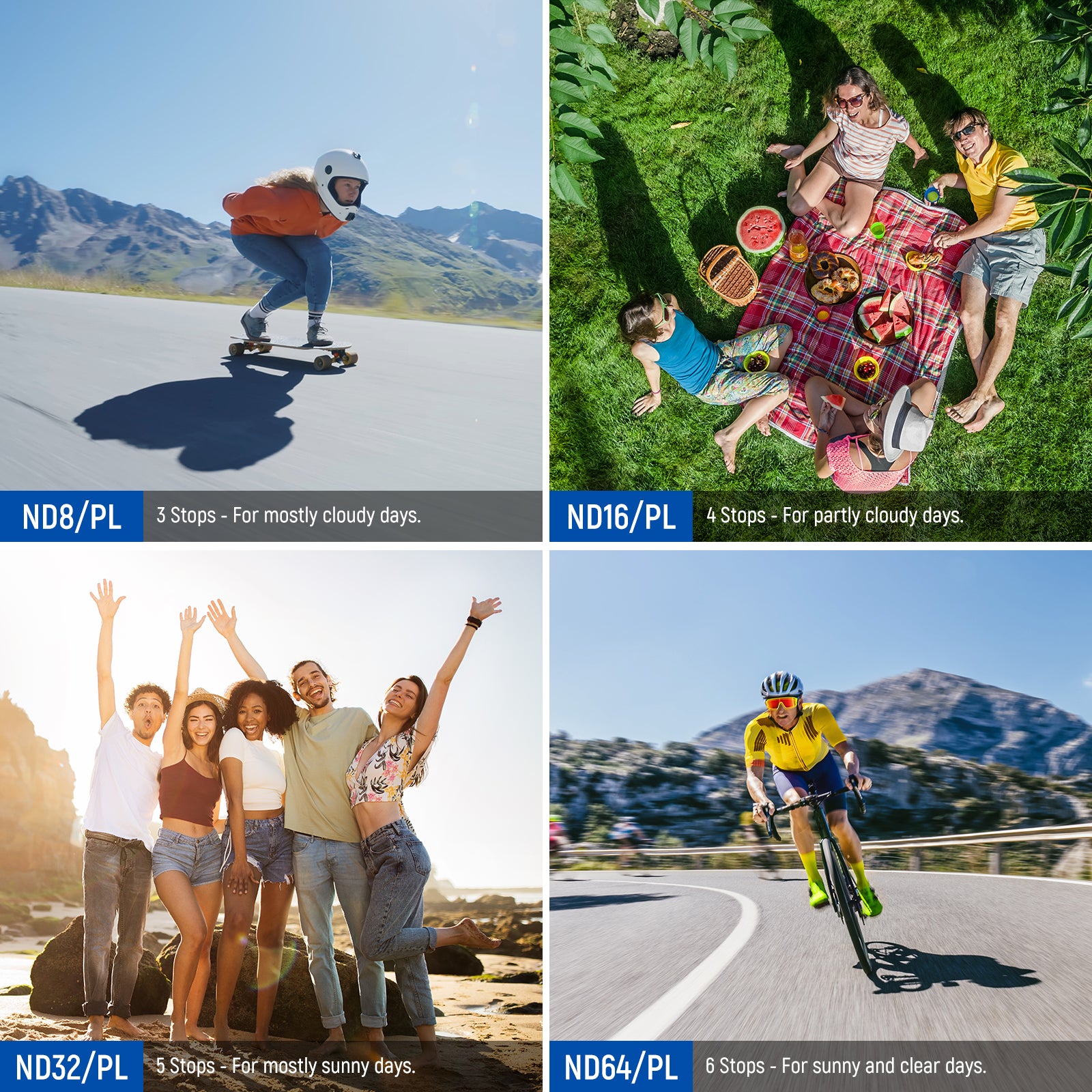 - Effortless Exposure Balance- The filters reduce the light entering the camera by 3, 4, 5, and 6 stops respectively, suitable for long exposure photography on sunny days and bright outdoor conditions. They allow you to shoot at slower shutter speeds with larger apertures and bring expressive motion blur effects on moving subjects