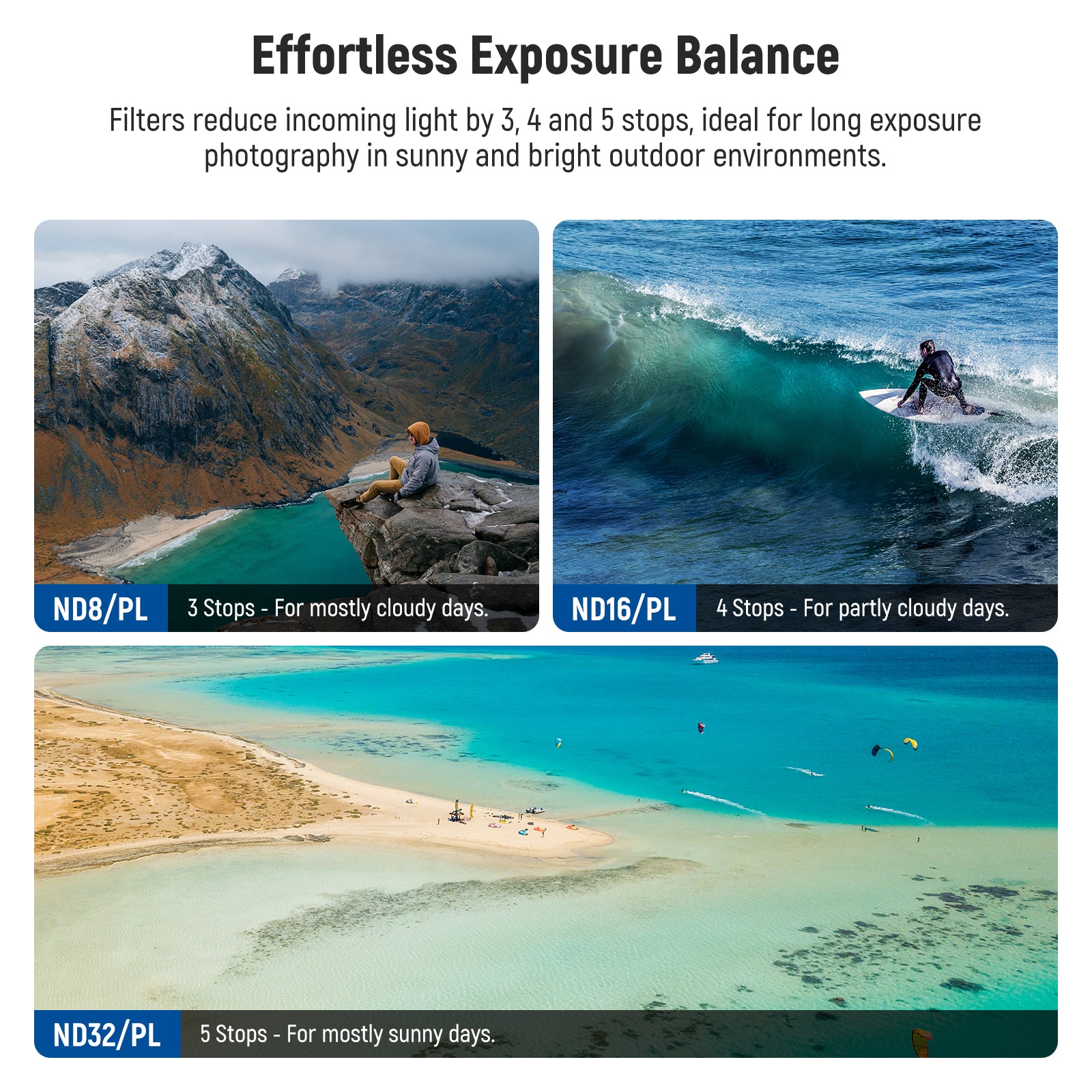 - Combination of ND & PL Filters- Three ND/PL filters (ND8/PL, ND16/PL, ND32/PL) reduce light 3, 4, and 5 stops respectively. They combine ND and polarizing effects, enable precise exposure control and improve color, contrast, and detail in your images while effectively reducing glare and reflections. By simplifying your workflow, they are ideal for outdoor video recording and landscape photography