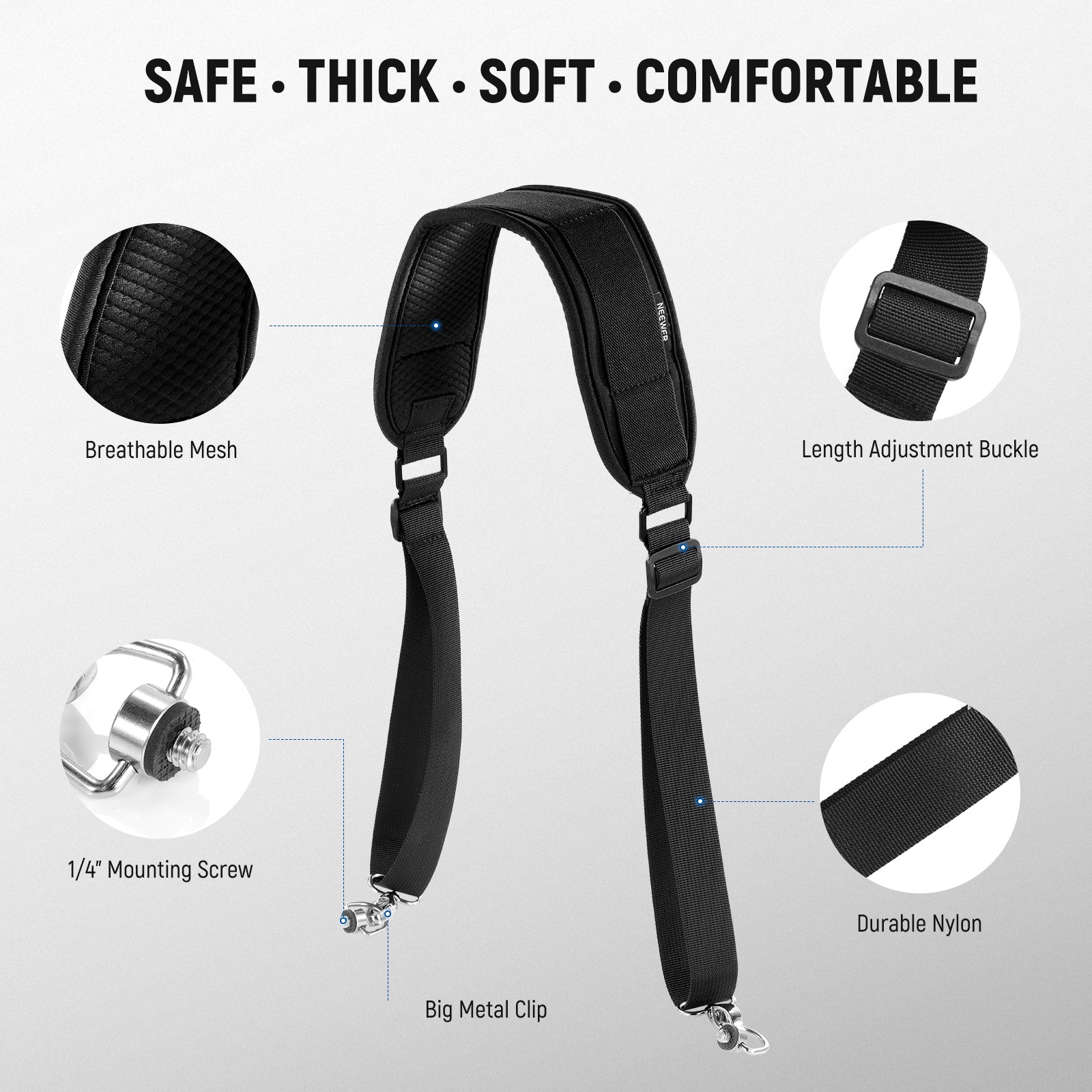 - Soft & Comfortable Neck Pad- The soft and breathable neck pad can evenly distribute the weight to avoid muscle stress and neck pain. Additionally, it increases stability and prevents the strap from slipping off when filming on the go