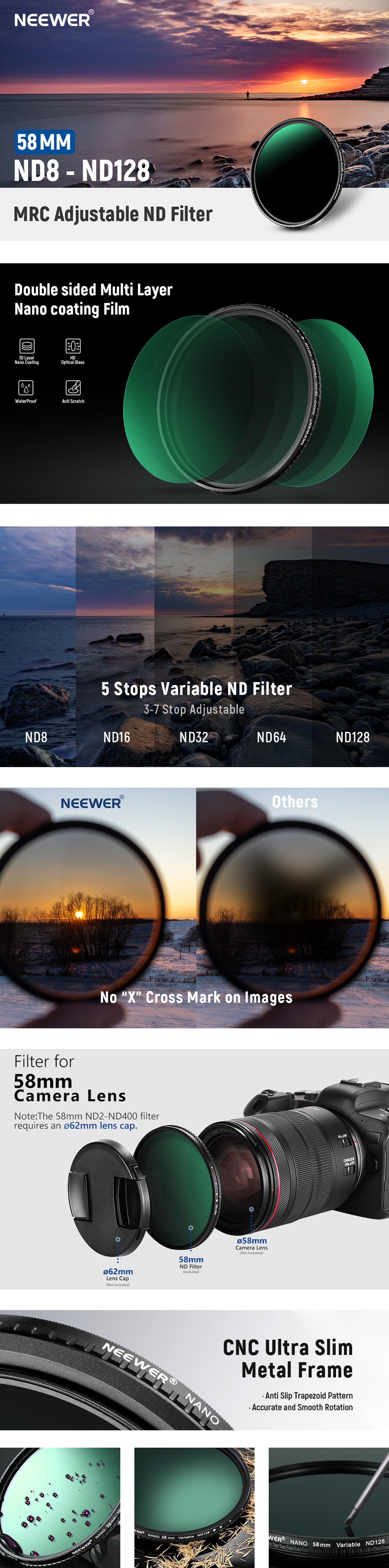 5 Stops Variable ND Filter- The NEEWER ND8–ND128 Variable Filter is adjustable from 3 to 7 stops, with a rotating ring to reduce light intake and extend exposure time when shooting at slower shutter speeds and wider apertures. Perfect for capturing rivers, waterfalls, light trails, and other moving subjects with dynamic motion blur.