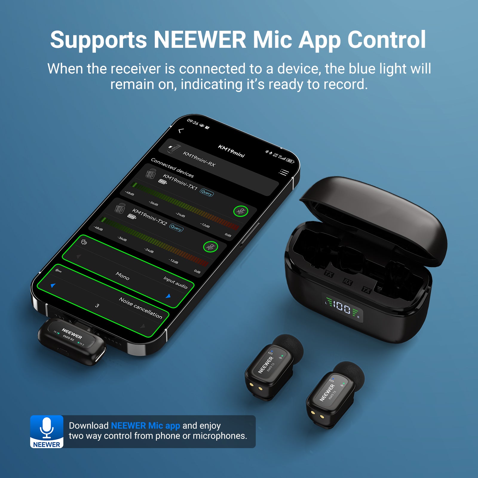 • Easy Wireless Connection- Press and hold the power button to turn on the transmitter (flashing blue light). Then, search for "KM19B" in your phone to connect. Once connected, open the NEEWER View app and ensure that "KM19B" appears in the top-left corner. Use the app's built in recorder to capture audio, or run the app in the background when recording with other apps