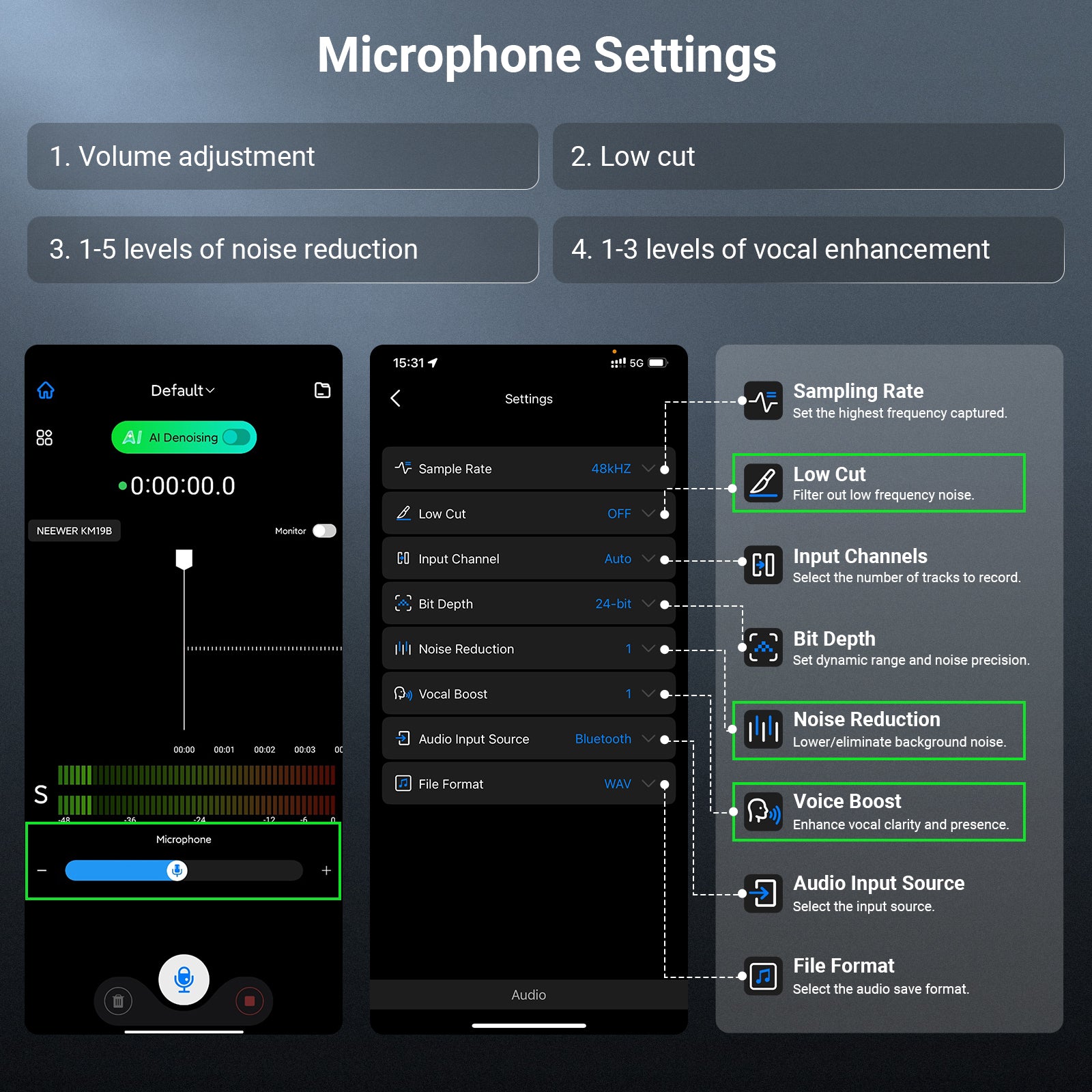 • Two Way App Control- Download NEEWER View app and enjoy two way control from phone or microphones. Advanced functions in the app include 3 level vocal enhancement, low cut, and 5 level noise cancellation