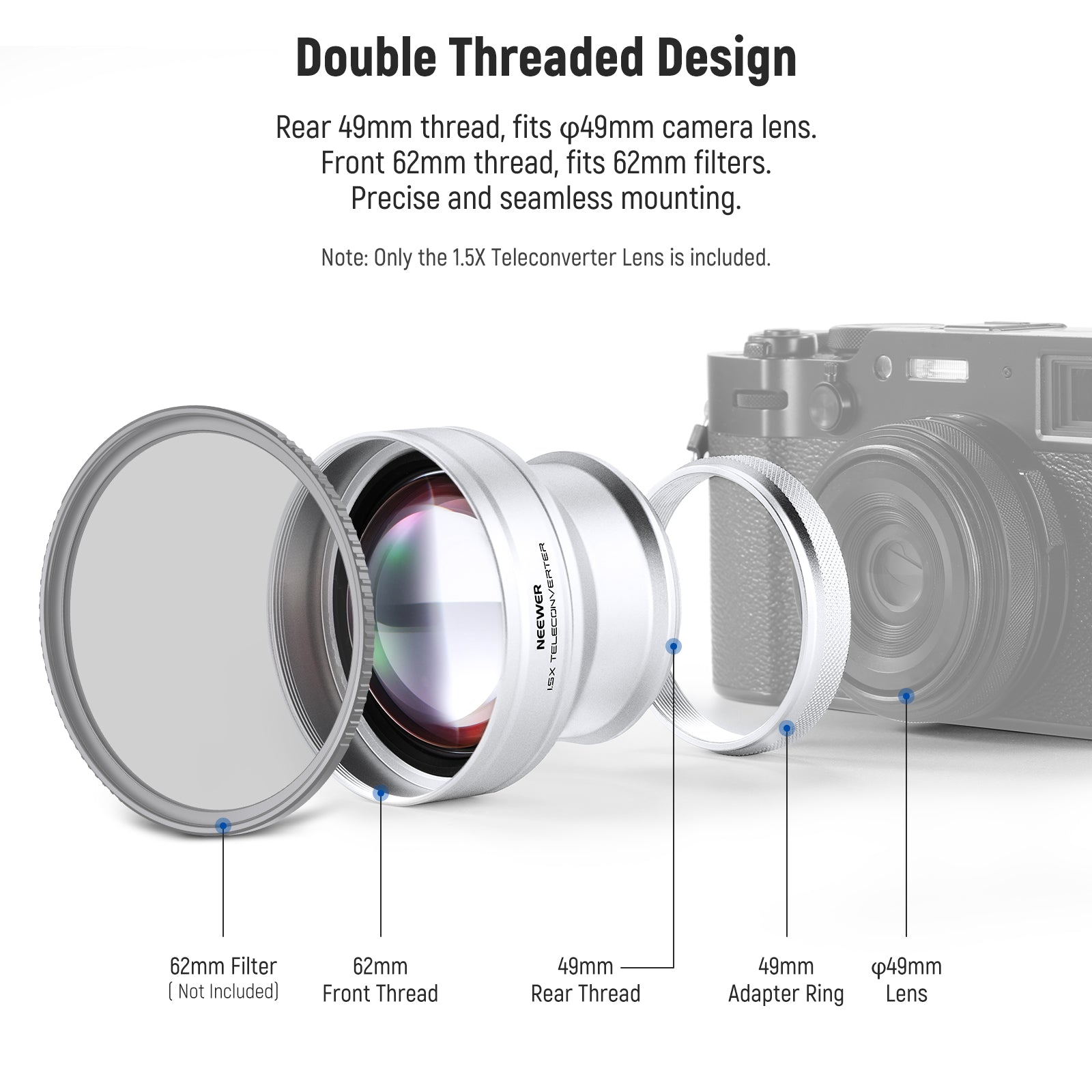 - Front 62mm and Rear 49mm Thread Design- This teleconverter features a 62mm front thread for attaching filters like UV, CPL, and ND. It is fully compatible with X100 Series cameras using a 49-49mm adapter ring. Without the adapter, it fits lenses with a 49mm thread