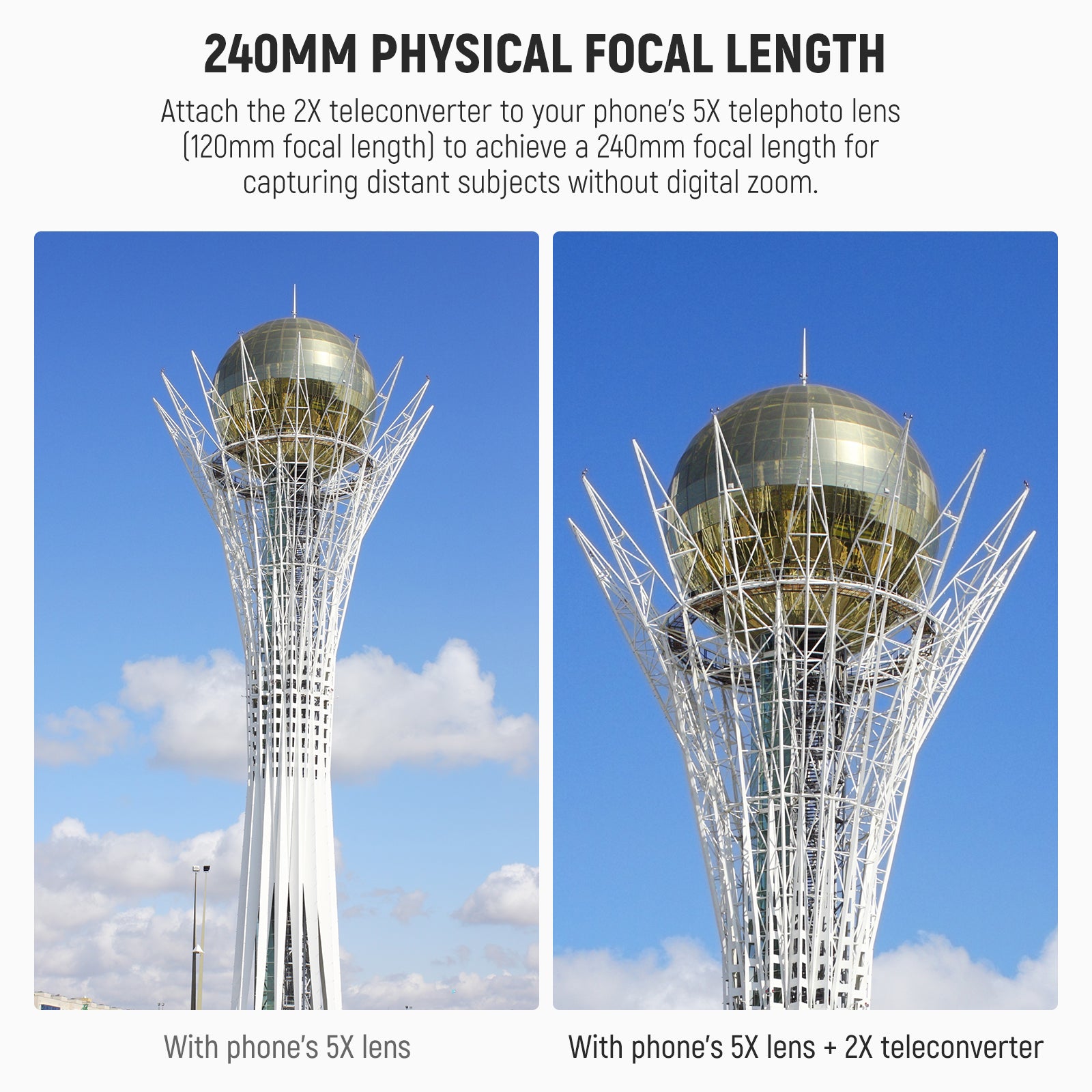 - 2x Telephoto Lens Converter- Designed for smartphones with a built-in 5x telephoto camera, this converter doubles the optical zoom capability, turning a 5x (120mm equivalent) lens into a powerful 10x (240mm equivalent) zoom. It enables distant shooting without digital cropping and image loss
