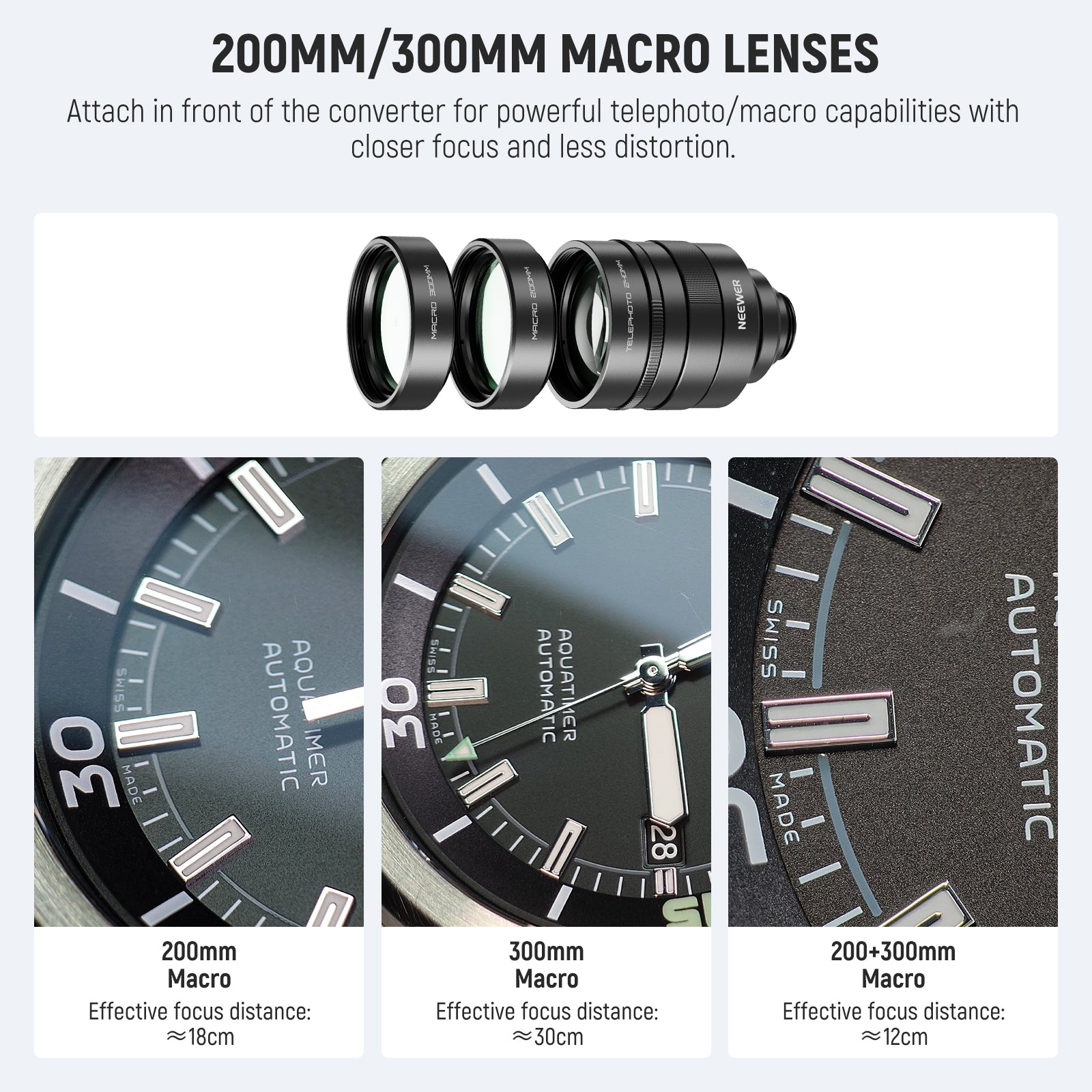 - 200mm/300mm Macro Lenses- Attach these macro lenses in front of the converter to achieve powerful telephoto macro capabilities with closer focus but less distortion. Use individually for different magnifications (200mm or 300mm), or stack them together for a stronger magnifying effect