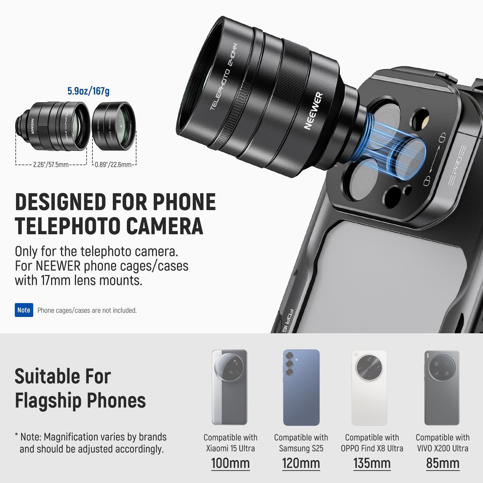 - Compact and Lightweight- Compared to standard external zoom lenses, this 2x converter is shorter and lighter. It features a 17mm thread for 17mm threaded phone cages, cases, and lens clips