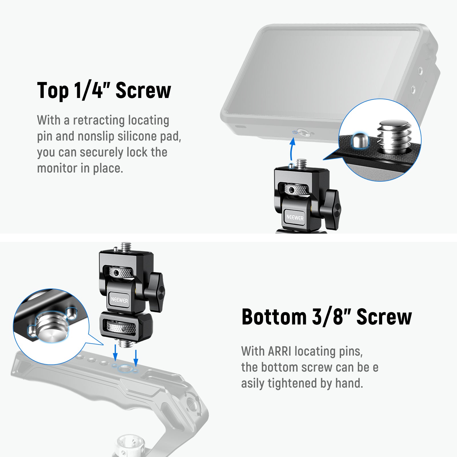 - ARRI Style Camera Monitor Mount- Designed to effortlessly and securely mount 5"~7" camera monitors on the top of the camera cage (like NEEWER CA011, CA004, CA002). The bottom 3/8" knurled thumbscrew with ARRI locating pins can be easily tightened by hand. Seamless compatibility with SmallRig camera cages, video rigs, top handle, and compatible with small rig other accessories