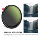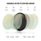 - Variable ND2-ND400 Filters with Putter- This variable ND filter helps control the amount of light reaching your camera sensor with 1-9 stops available. Simply screw this ultra-slim filter on your camera lens, then hold the putter to rotate the filter to accurately adjust from ND2 to ND400 with ease. By reducing exposure brightness, it enables you to better control shutter speed, well suited for capturing river, waterfall, light trails, and another dynamic motion blur