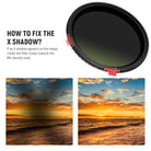 - Usage Notes- 1. An X-patterned glare or ghosting may appear when light is reduced to ND256; 2. Actual ND effects may differ at the Min and Max marks as well as in different environments; 3. For long exposure, please purchase ND1000 or ND2000 filters