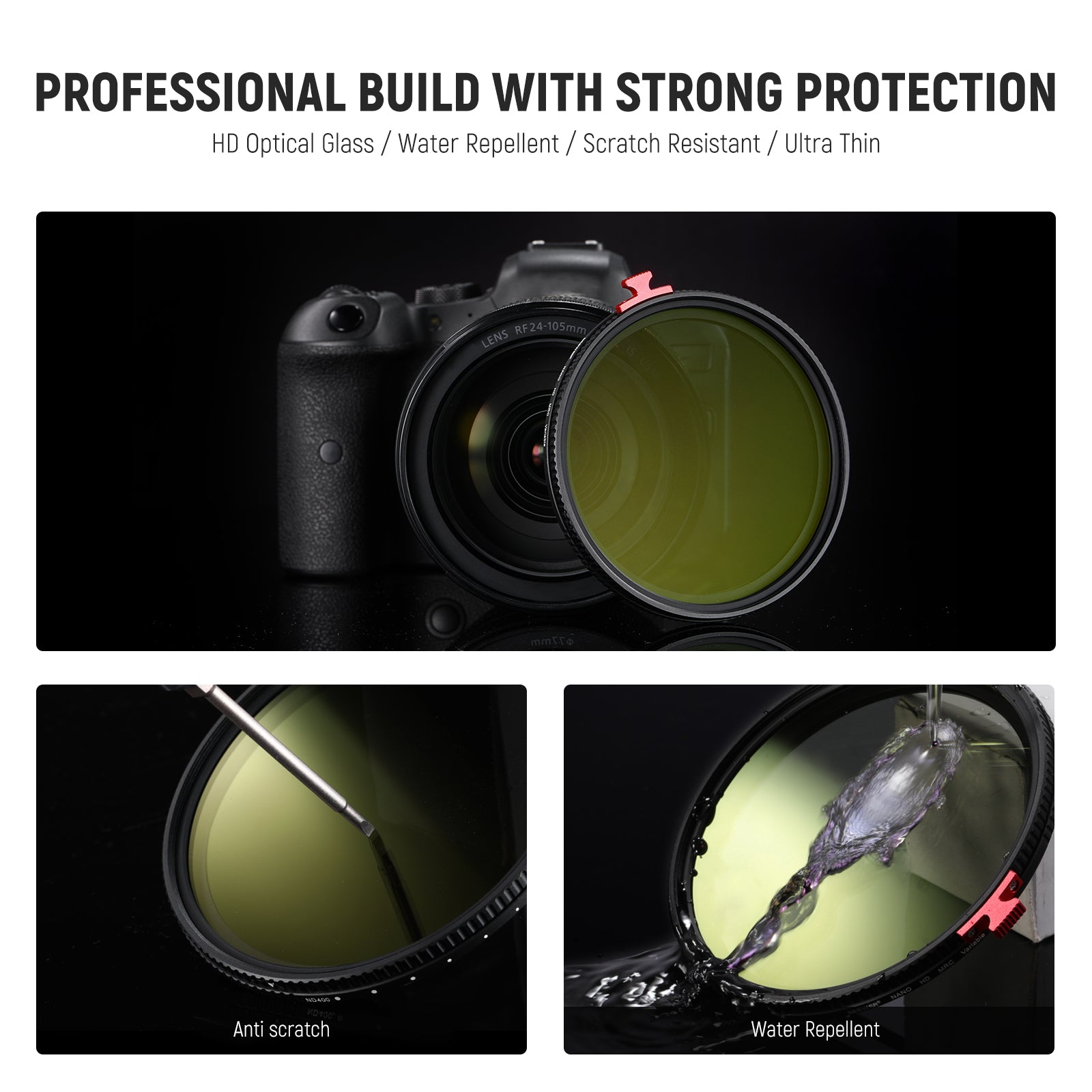 - Quality Build with HD Optical Glass- Made of premium HD optical glass, the high-definition ND filter delivers a cinematic photo look without distorting the image quality. The 30 layers of double-sided nanometer coatings, with 0.1% minimum light reflectivity, reduce flare and ghosting while protecting the filter against moisture, oil, dust, and scratches