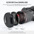 - About its Compatibility- This 67mm ND filter can only fit a 67mm camera lens. Please confirm the filter thread size marked on your camera with the "Ф" (diameter) symbol before ordering. When mounted on the camera, the ND filter also protects your camera lens from scratches. A protective case and cleaning cloth are also included. A 72mm lens cap is required to fit on the 67mm lens filter but is NOT included