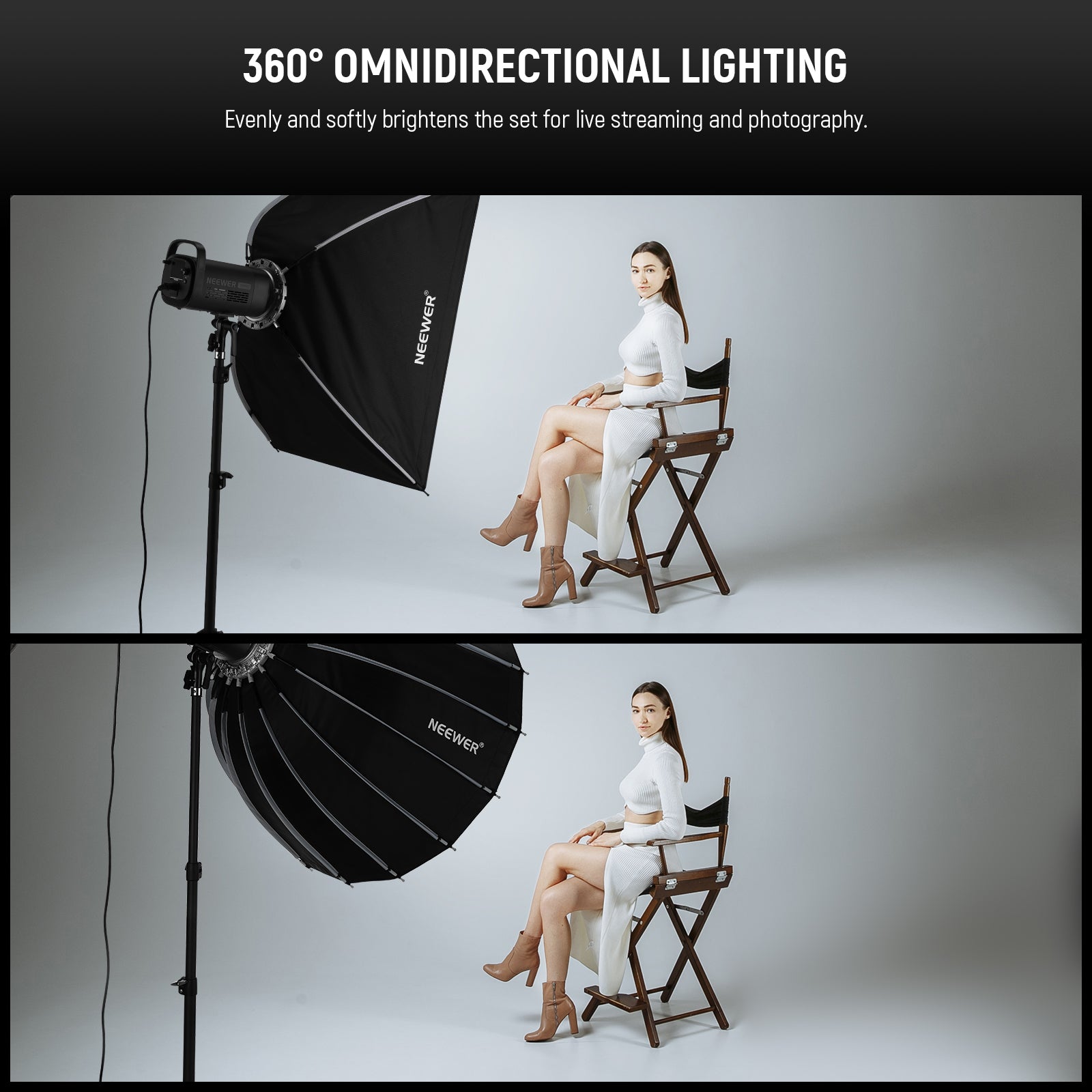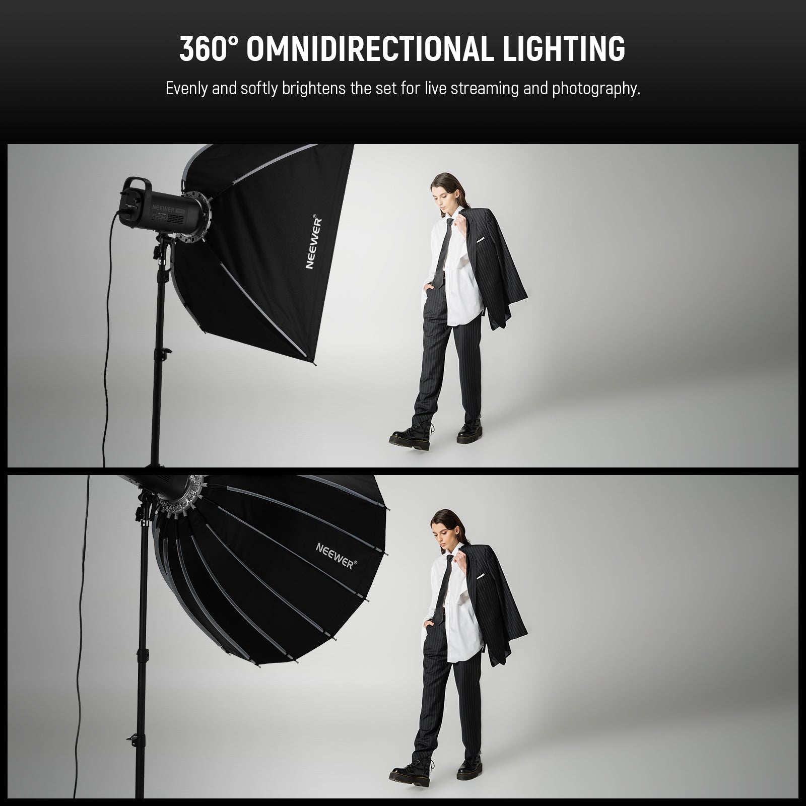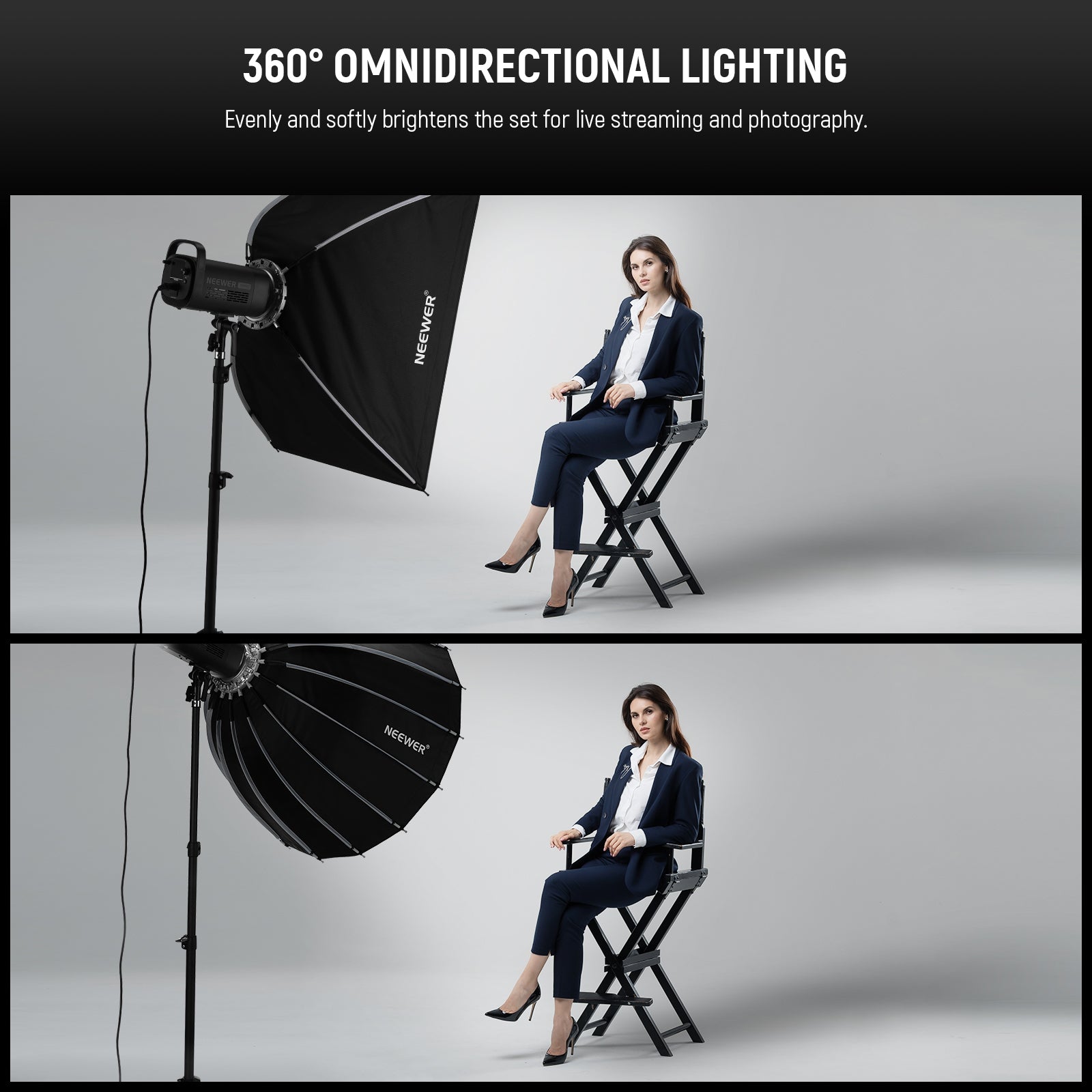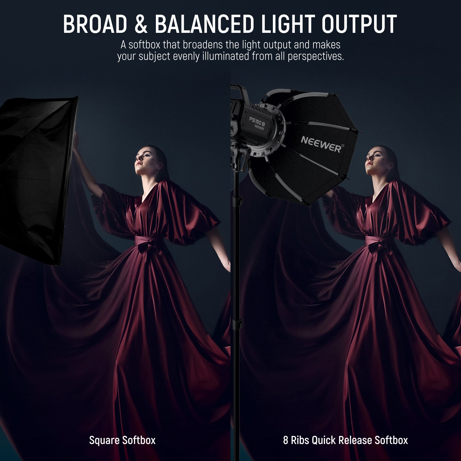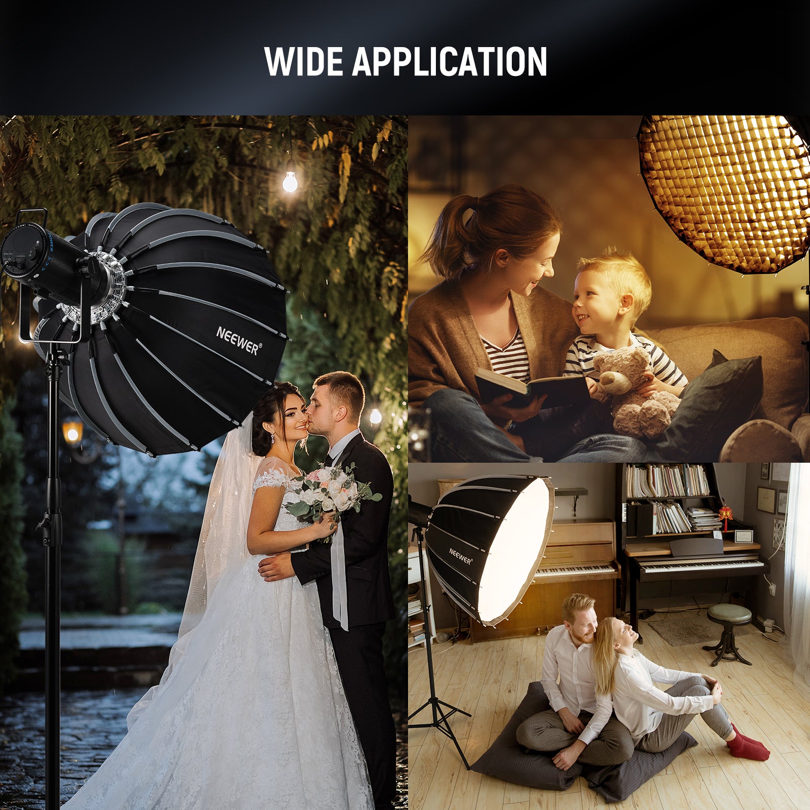 NEEWER offers a variety of softboxes, including parabolic, octagonal, lantern softboxes, and more. Most of these photography softboxes are portable and collapsible. These softboxes can give you better even lighting and are perfect for shooting portraits or events such as weddings, proms, or corporate events on location. Choose a good softbox to elevate your photography to the next level.