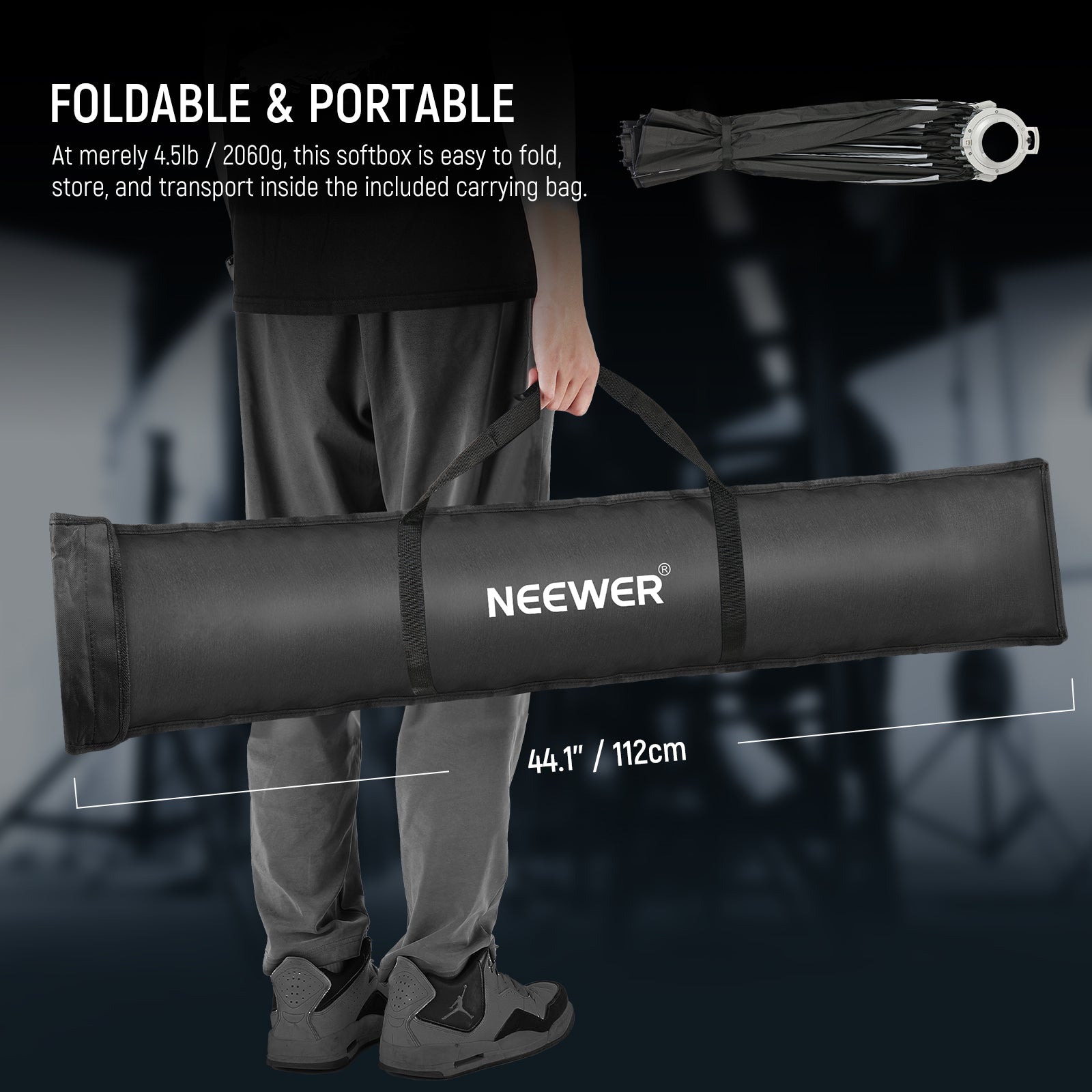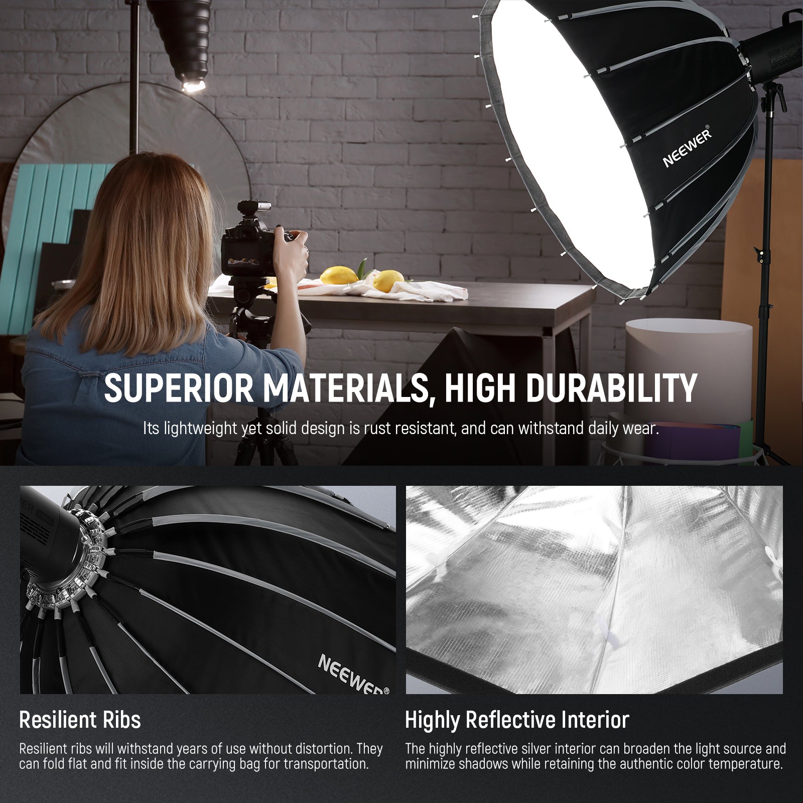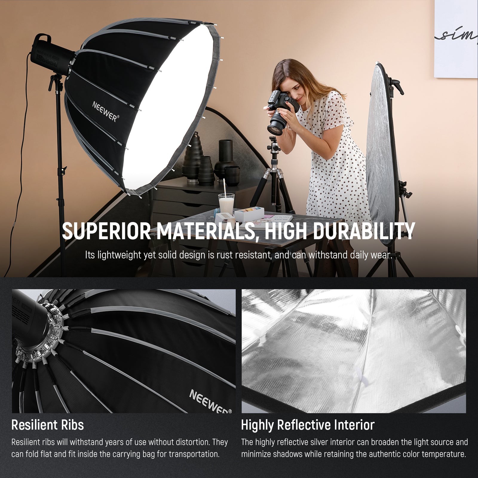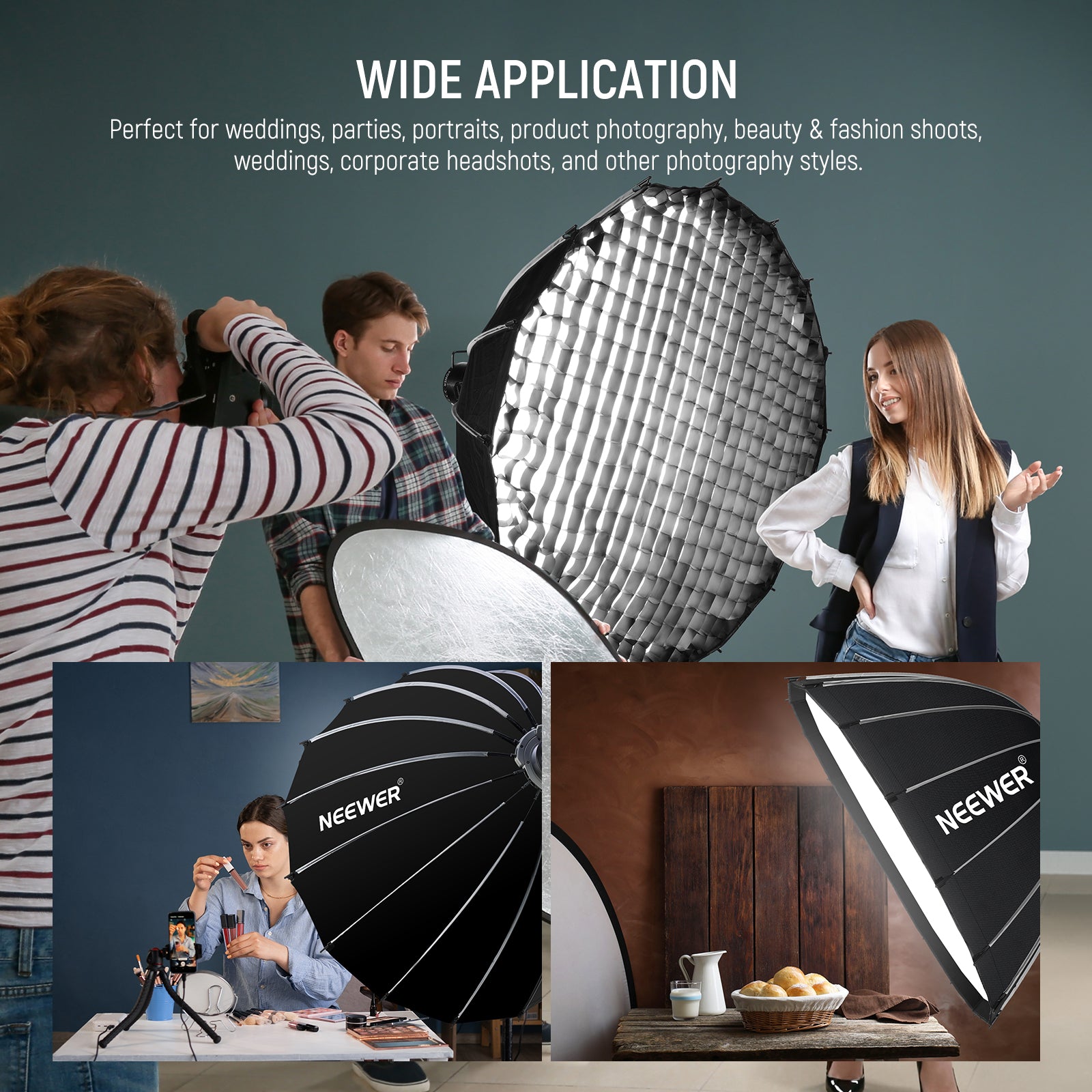 NEEWER offers a variety of softboxes, including parabolic, octagonal, lantern softboxes, and more. Most of these photography softboxes are portable and collapsible. These softboxes can give you better even lighting and are perfect for shooting portraits or events such as weddings, proms, or corporate events on location. Choose a good softbox to elevate your photography to the next level.