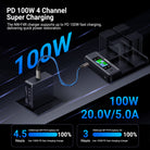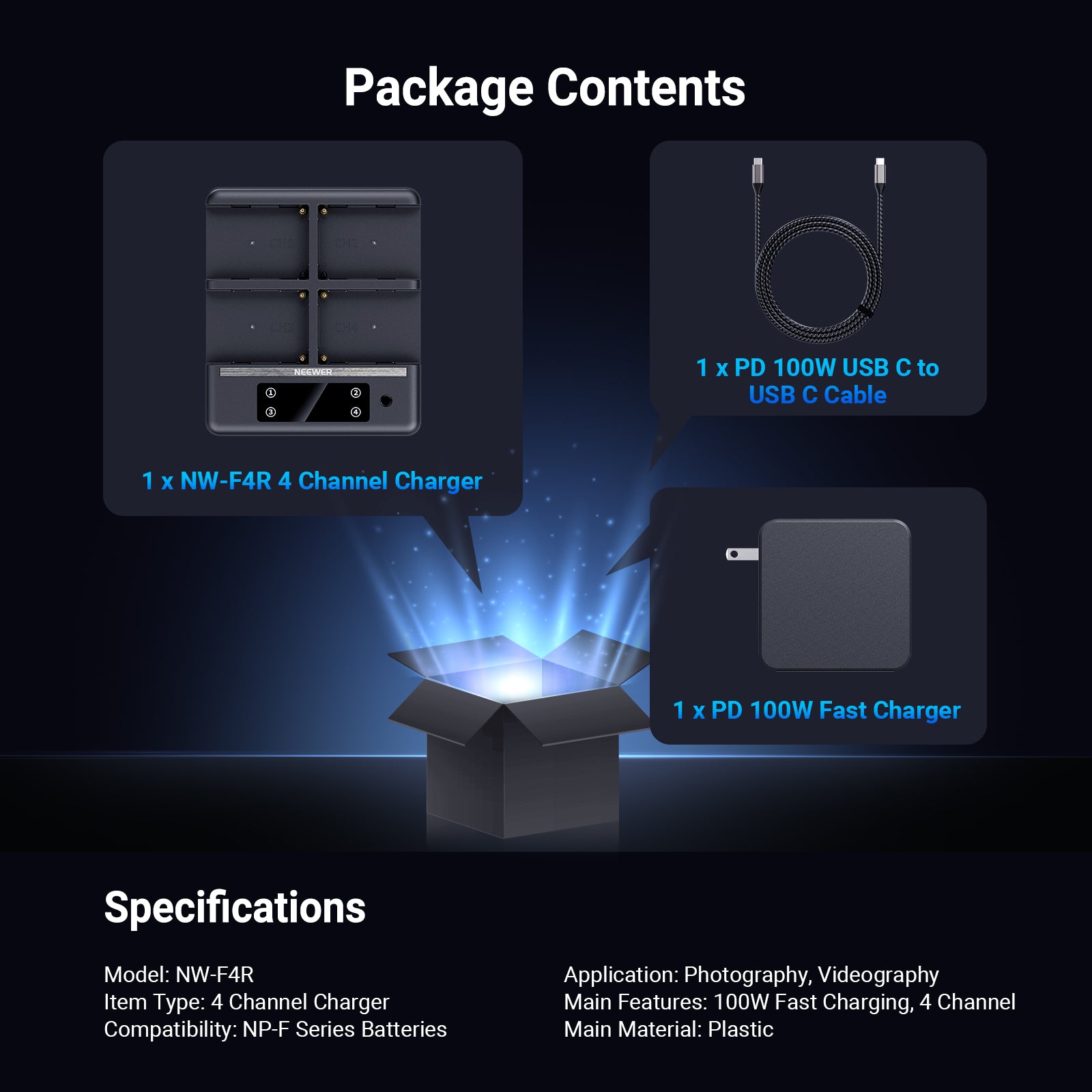 • PD 100W 4 Channel Fast Charging- The NW-F4R charges up to 4 NPF batteries at once. It supports PD 100W ultra fast charging when used with a 100W PD charger (sold separately), having four 10500mah NP-F970 batteries fully recharged in 4.5H, or four 7800mah NP-F970 batteries in 3H. With a current detection switch, it auto adjusts between the two output levels based on the battery model for optimal charging efficiency. Note: To achieve full power output, a PD 100W charger or higher is required