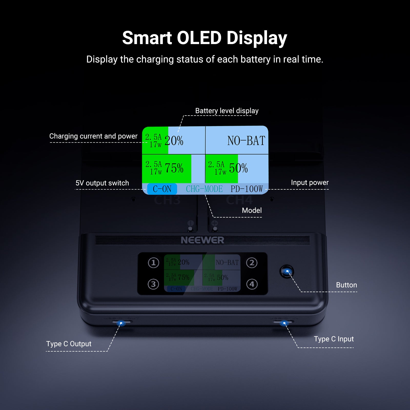• Dual USB C & Smart OLED Display- This 4 channel NPF charger includes 2 USB C ports for input and output, with the output port automatically disabled when the power consolidation function is active. The OLED screen provides real time updates on each battery’s charging status and displays their power levels, allowing you to easily monitor and know when your batteries are fully charged and ready to use
