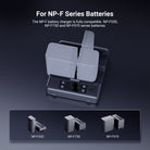 • Comprehensive Circuit Protection- Each slot of the NP-F battery charger features a built in advanced circuit that protects against overcharging, short circuits, overheating, overcurrent, overvoltage, and other potential hazards, ensuring a safe and reliable charging process