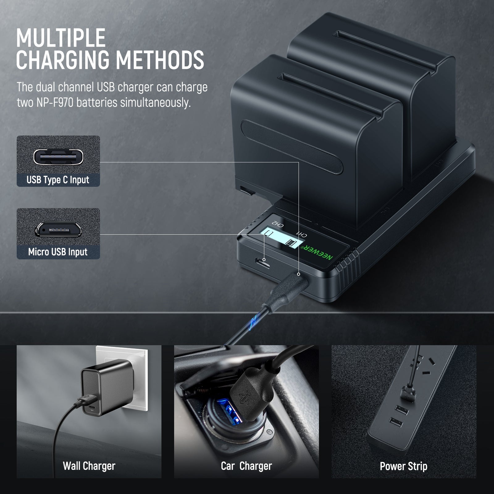 - Dual Battery Charging- You can charge two compatible NP-F batteries simultaneously by placing them on the charger correctly. The fast npf battery charger has an LCD that lets you know the charging status in real time
