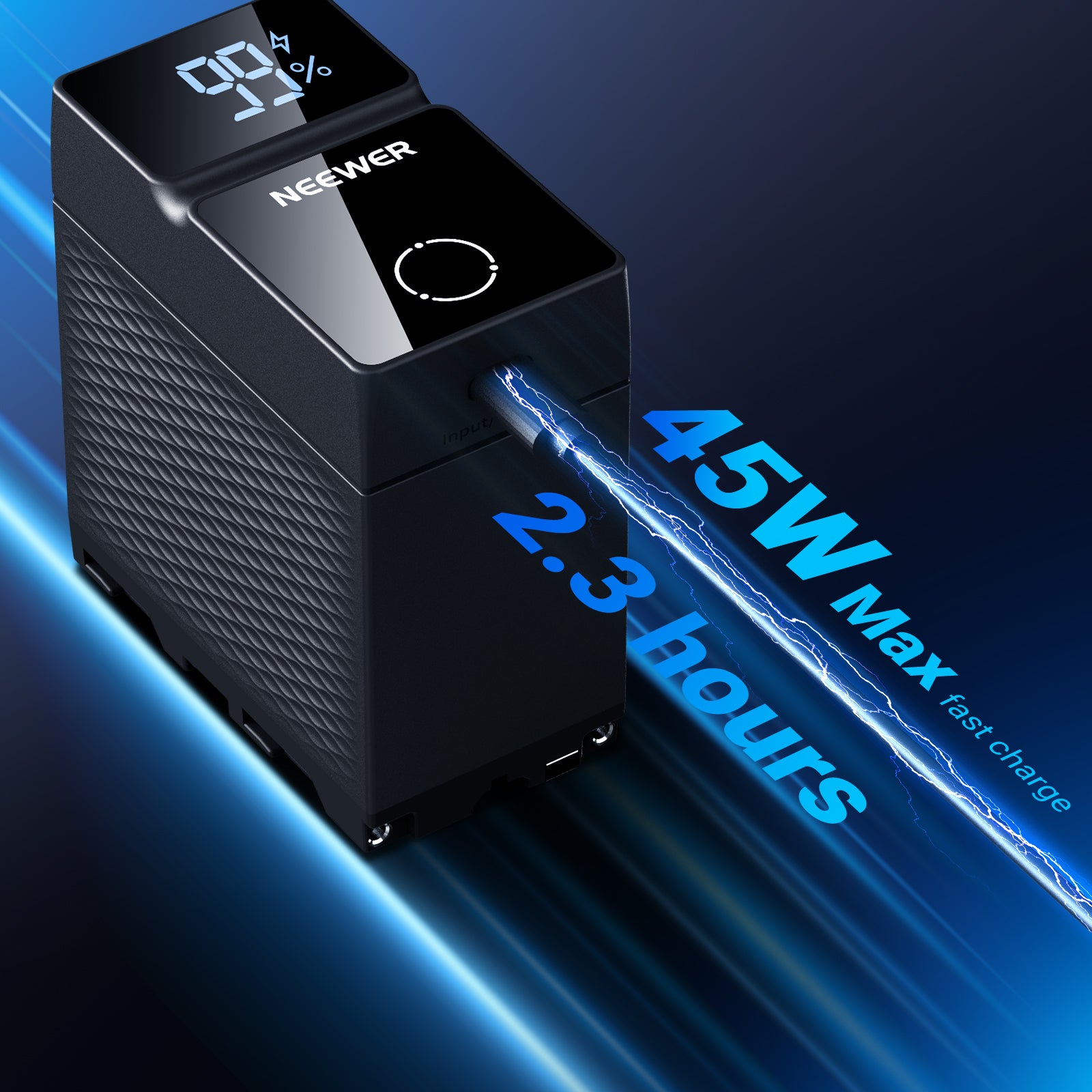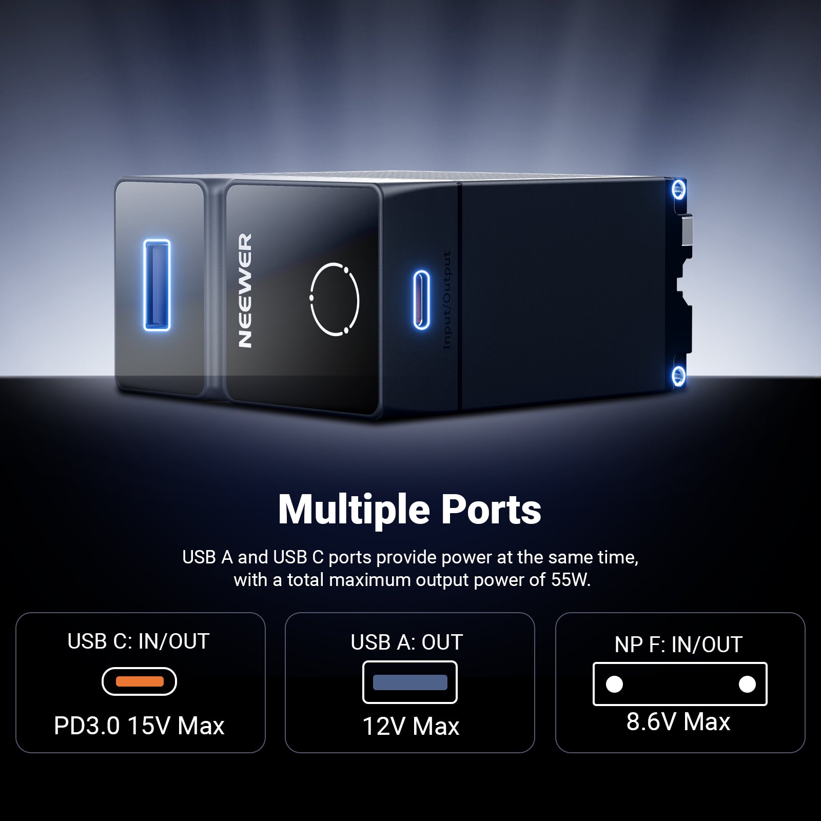 • Dual Port NP-F Battery with 45W PD Fast Charging- Featuring a USB A output (up to 24W) and a bidirectional USB C port (up to 45W), this f970 battery delivers up to 55W when both ports are used together, ideal for powering a camera, monitor, or other gear simultaneously. The USB C port supports bidirectional 45W PD fast charging, enabling rapid device charging and a full battery recharge in just 2.3 hours