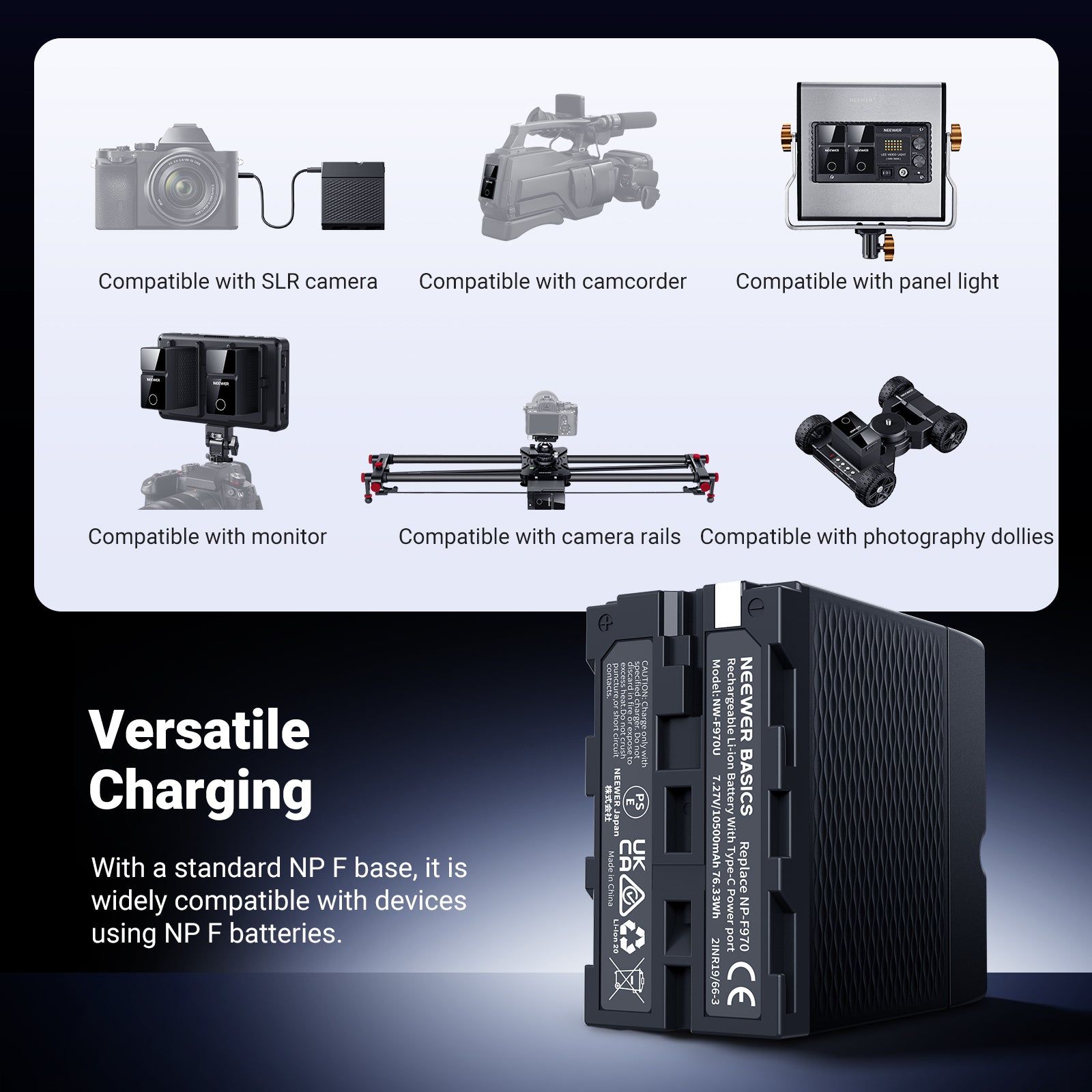 • Extensive Device Support- Featuring a standard NP-F mount, this lithium ion NP-F replacement battery is widely compatible with Sony handycam camcorder and devices that use NPF batteries, including cameras, LED video lights, monitors, follow focus systems, camera sliders, and stabilizers, providing a continuous and reliable backup power supply for prolonged shooting sessions