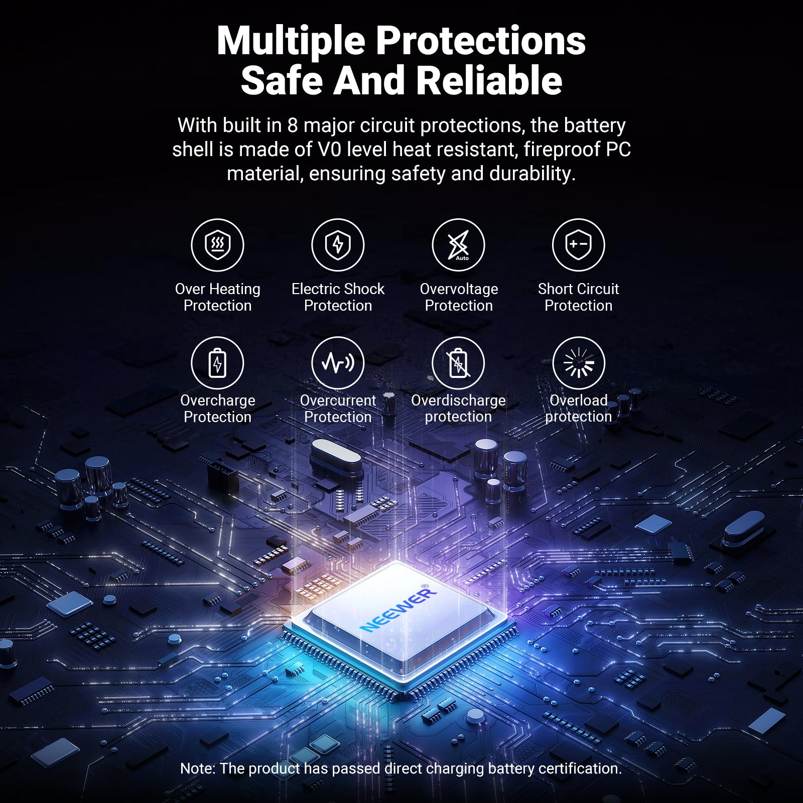 • Advanced Multi Protection Safety System- Built with premium battery cells and a sophisticated protection system, the NP-F replacement battery safeguards against overheating, overvoltage, overcurrent, overcharge, overdischarge, overload, electric shock, and short circuits to ensure battery safety.Note: Do not use it to charge external devices while being recharged itself,as doing so may cause overheating and reduce battery lifespan.