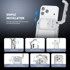 - 1 Click Installation & Full Access - Opened and locked via the side button, the phone cage needs no assembly and maintains full access to the camera, port, and buttons. A detachable rubber ensures seamless use of the Camera Control, and the hollow design is fully compatible with MagSafe wireless charging and magnetic accessories