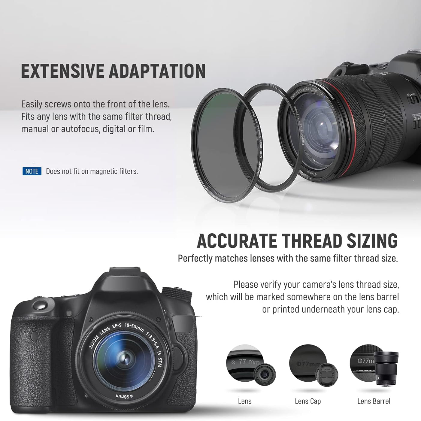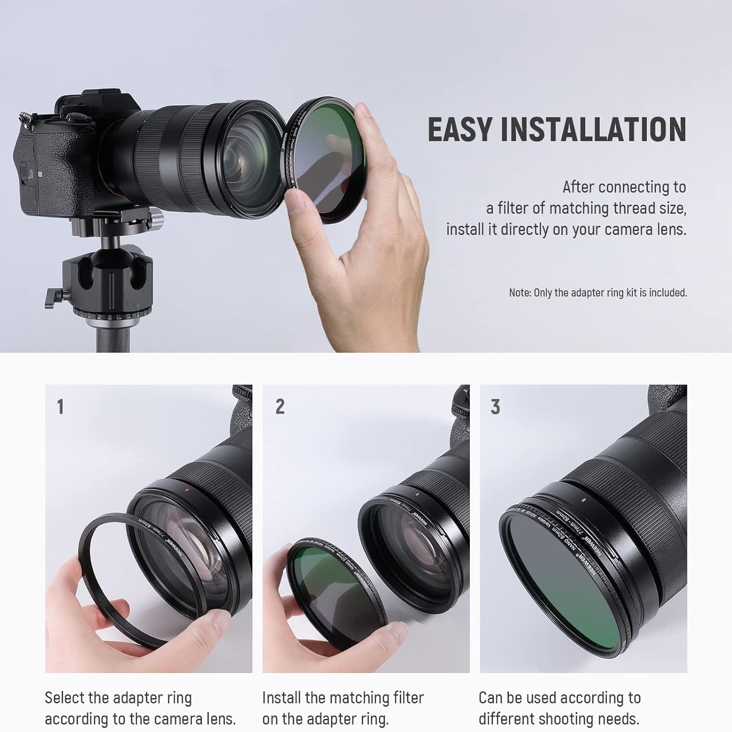 NEEWER offers step-up rings and step-down ring adapters, allowing lenses to be compatible with various filters and accessories of different sizes. These stepping rings are crafted from premium-grade aluminum with precision manufacturing to ensure smooth and secure mounting. They are extremely durable yet lightweight, featuring a polished, anodized matte surface for a sleek and professional finish.