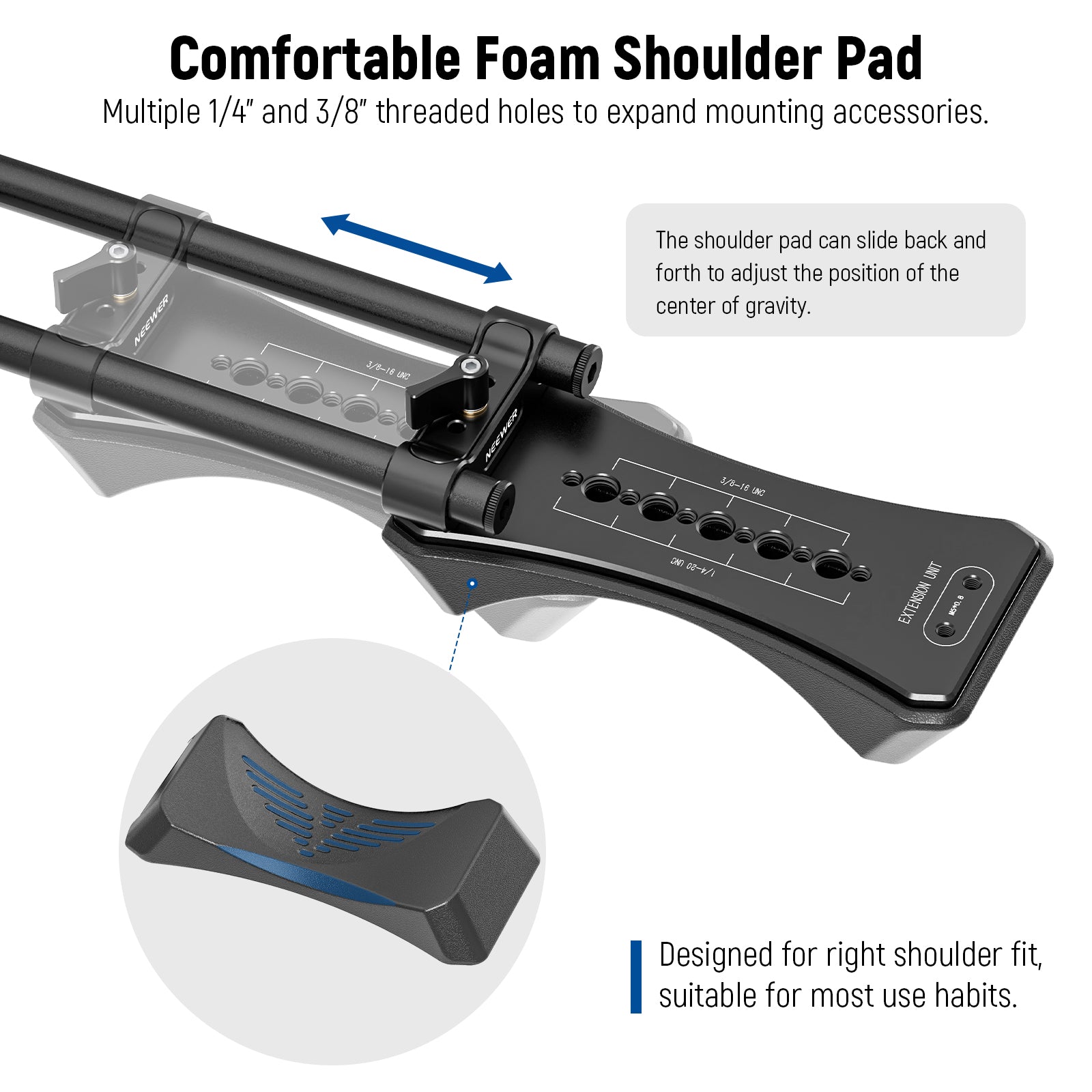 - Ergonomic Foam Shoulder Pad- Made of highly elastic foam and curved to rest on the shoulder comfortably, the ergonomic shoulder pad prevents shoulder fatigue and allows you to adjust the center of gravity by sliding it through the vertical bars. Several 1/4" threaded holes for additional accessory installation.