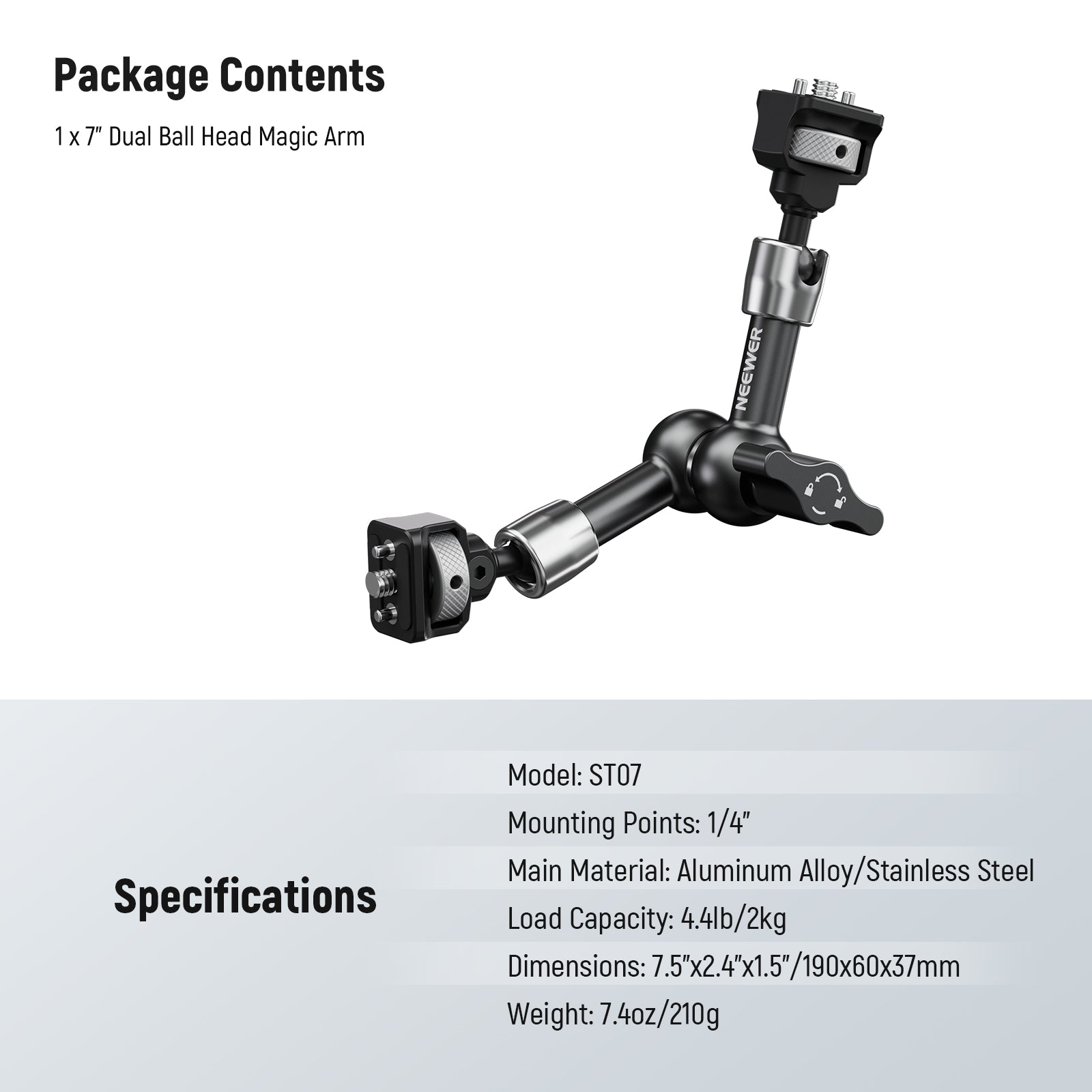 - Flexible & Stable Articulating Magic Arm- Featuring two articulated arms connected by a 360° friction gear joint, this 7"/18cm rosette magic arm camera mount with dual ball heads offers versatile positioning for DSLR mirrorless cameras, LED video light panels, microphones, field monitors (compatible with Atomos Ninja V), phone holders, action camera adapters, etc., and connects them to camera cages, camera tripods, or other camera rigs using a super clamp (not included). Max Load 4.4lb/2kg