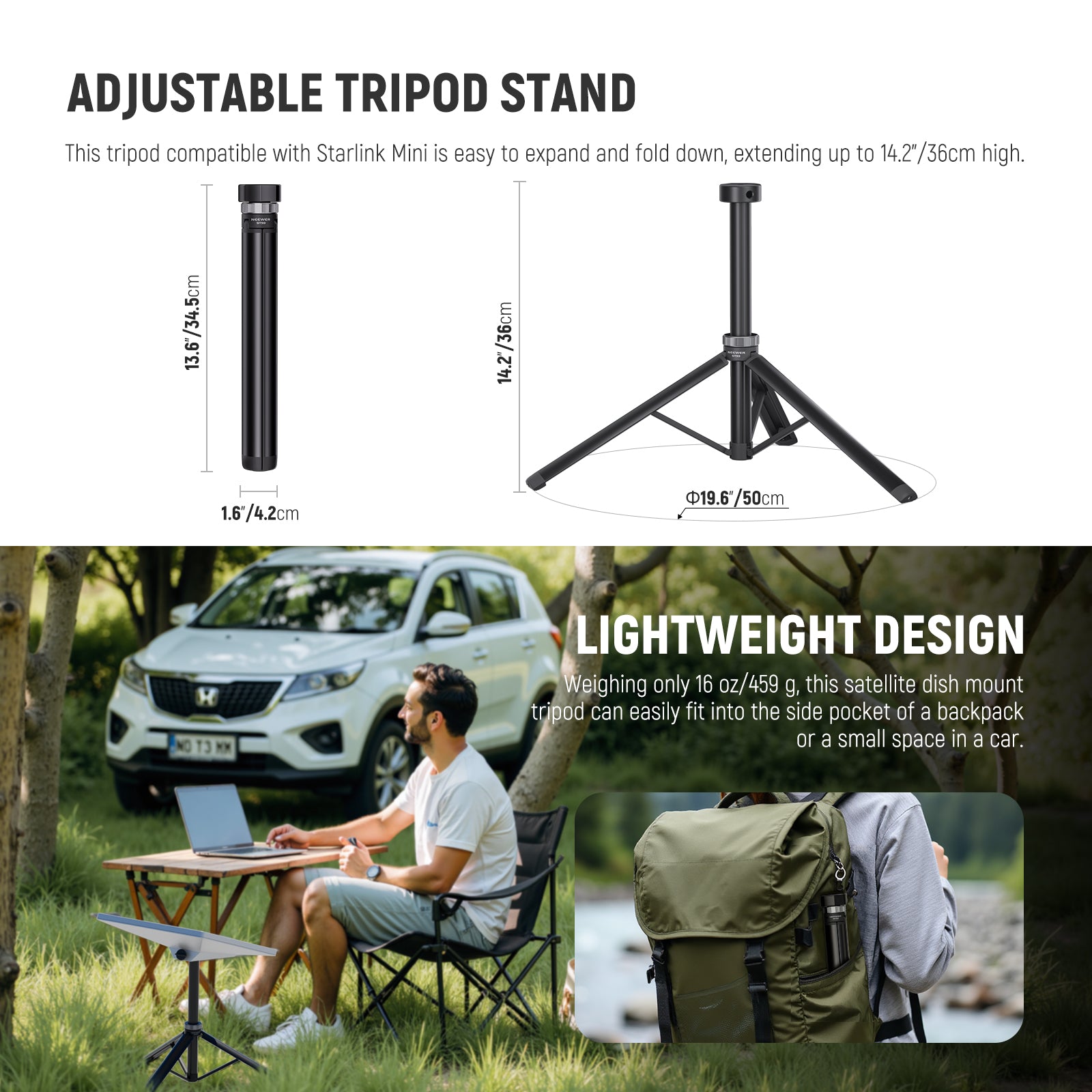 - Lightweight & Portable- Folded into a compact stick at 13.6"/34.5cm long and weighing just 16oz/459g, this satellite mounting tripod easily fits into a side pocket of your backpack, or tucked into a narrow space in your car. Perfect for camping, traveling, sailing, or road trips, it allows for easy outdoor internet setup wherever you go