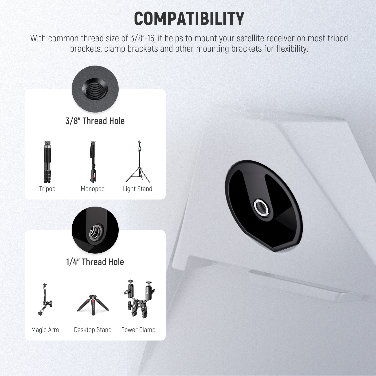 - Tripod Adapter 1/4" & 3/8" Thread Sizes- Includes a movable pipe adapter compatible with Starlink Mini, which features common thread sizes of 1/4"-16 and 3/8"-16, effortlessly attaching your satellite receiver to the tripod stand or other mounting brackets like clamp mounts and gutter mounts