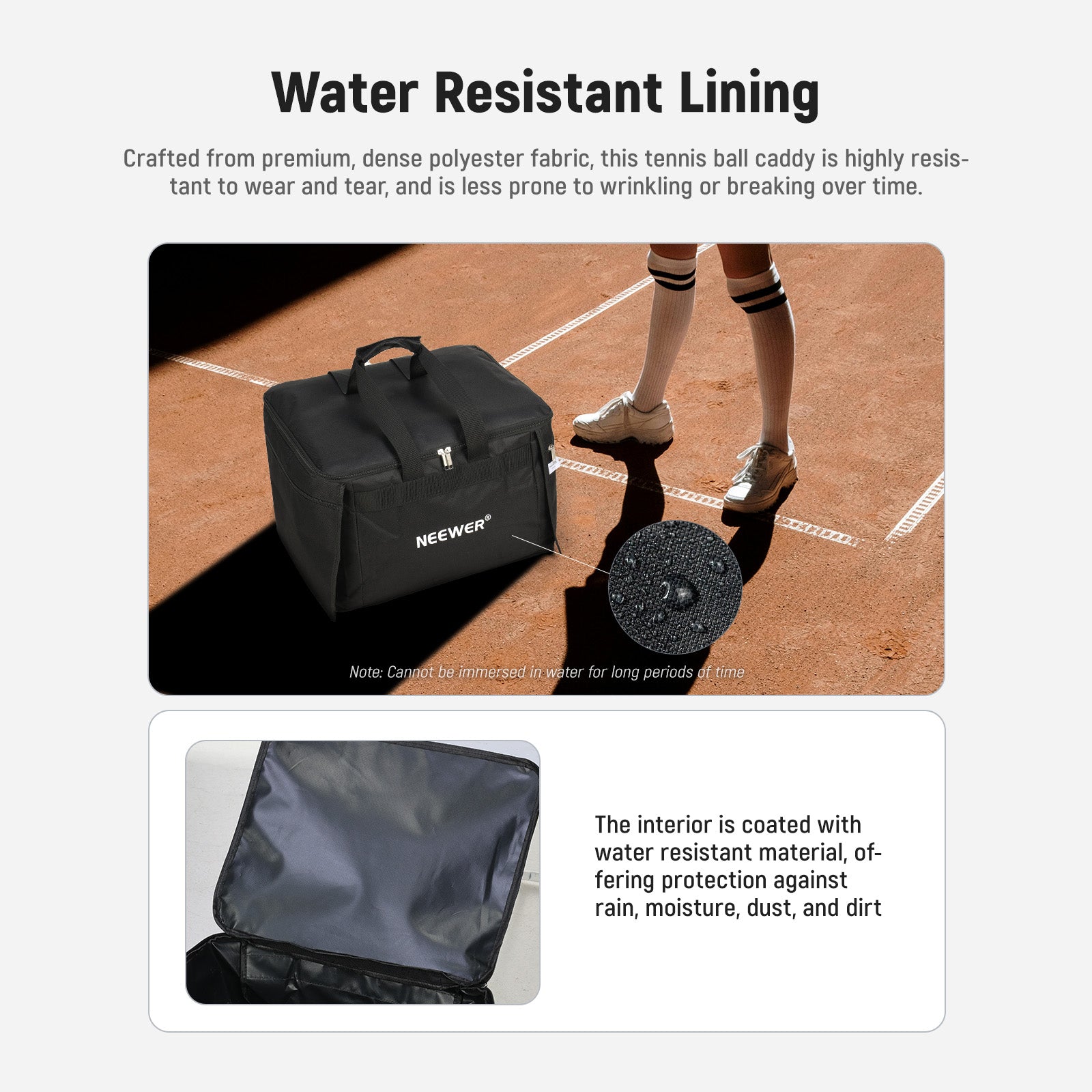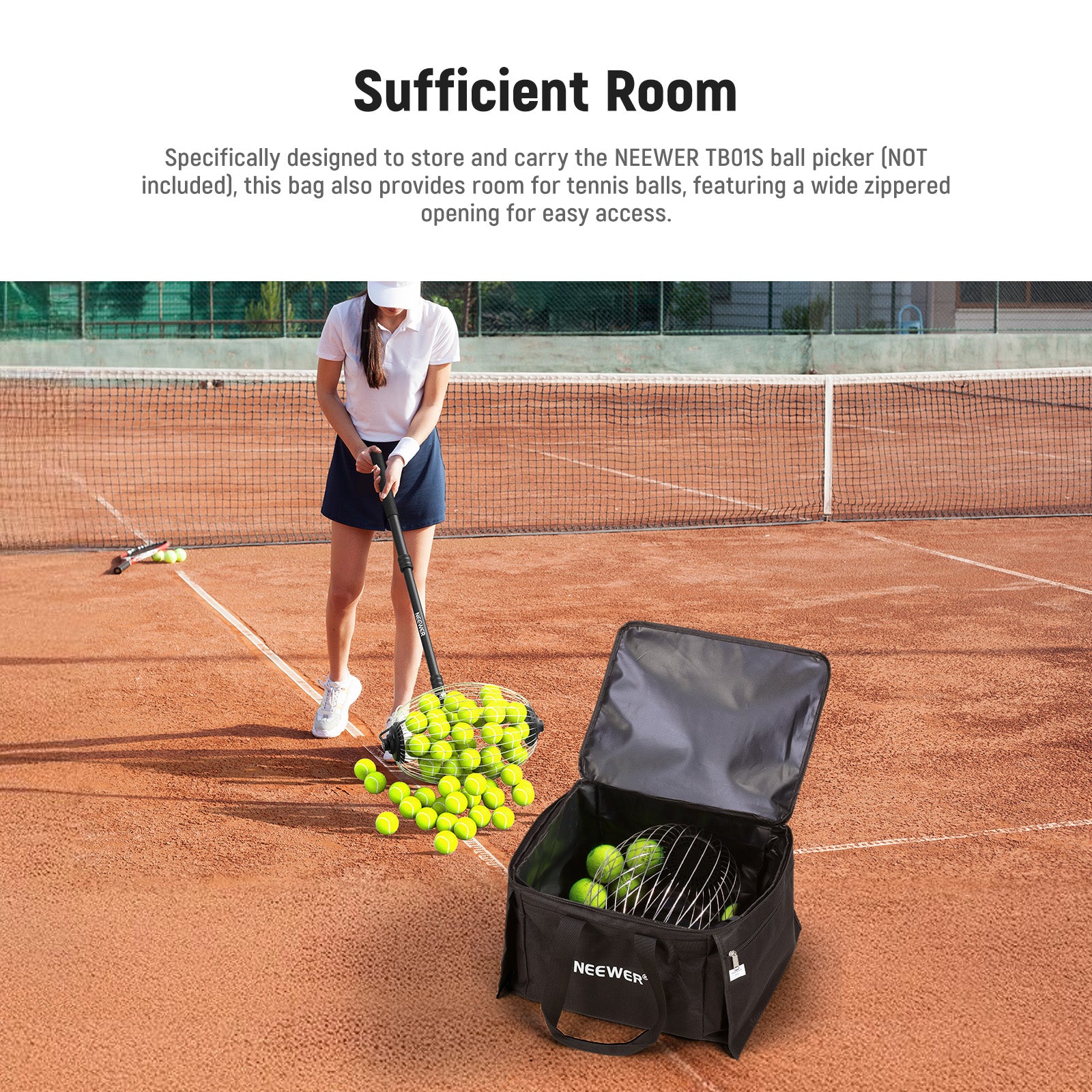 - Designed for TB01S Tennis Ball Picker- The TB01B tennis ball basket seamlessly accommodate the NEEWER TB01S telescopic ball collector roller, featuring two adhesive fasteners inside to securely hold the roller in place, making it easy to carry. It also serves as a perfect ball collection bag, pairing with the roller picker upper machine to maximize loading efficiency. NOTE: ONLY the carry bag is included