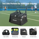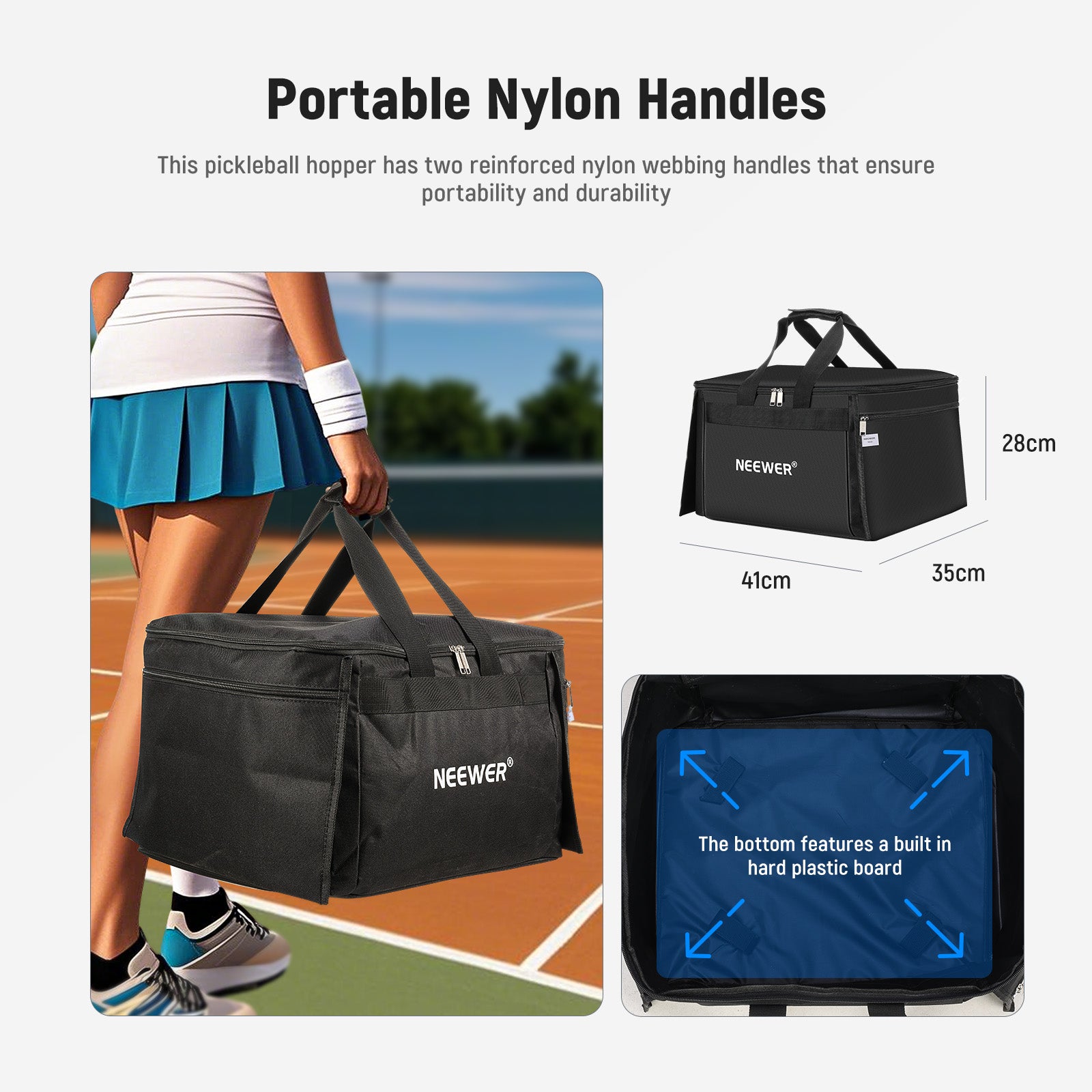 - Portable Nylon Handles- This pickleball hopper has two reinforced nylon webbing handles that ensure portability and durability, allowing for effortless transport to and from the court. The bag features a hard, supportive bottom that provides stability, preventing collapse whether it's placed flat or carried around