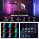 - 24 Bit Independently Controllable Pixels- 24 bit pixels allow you to independently adjust each pixel section's brightness, color temperature, and lighting effects. This LED video light equipment features 7 pixel effects (Color Replacement, Color Rotation, Single/Dual/Triple Color, Rainbow Effects, and Point Controlled Flame) and 18 special scenes, ideal for video recording, studio photoshoot filming, creative selfies, camera photography, live streaming of gaming, etc.